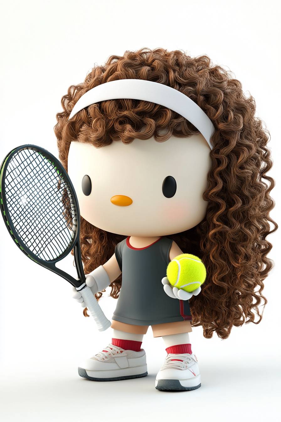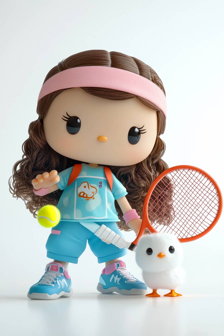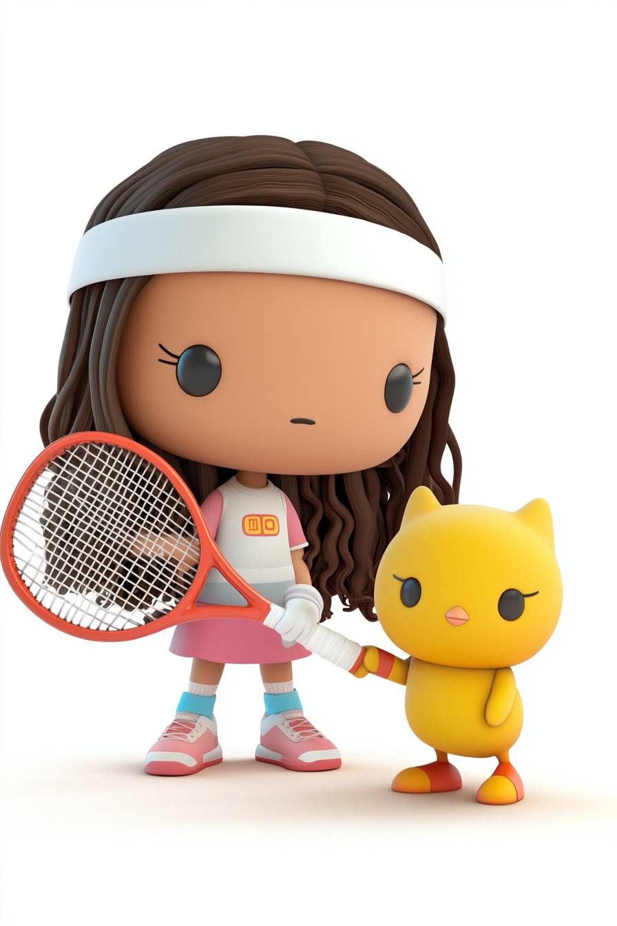 Hello Kitty is playing tennis with a Moroccan girl, who has long hair. A cute baby chick is playing tennis, wearing a headband and holding a racket in its hand, against a pure white background, in the style of Pixar, with a cute version of the characters, simple details, and high-definition photography.