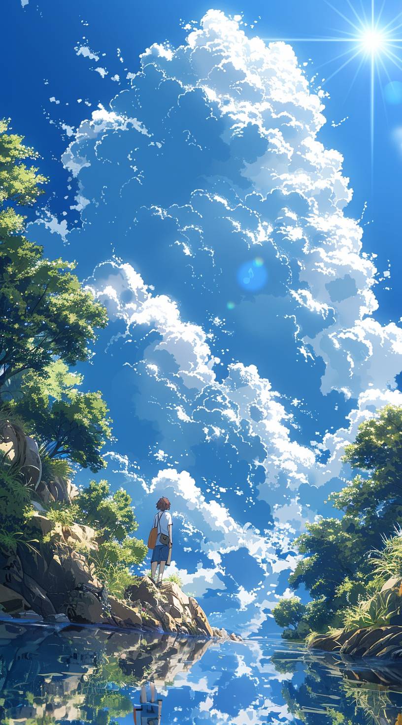 The anime-style image contrasts huge height differences, showcasing bright scenes and reflections during the exploration of unexplored regions.