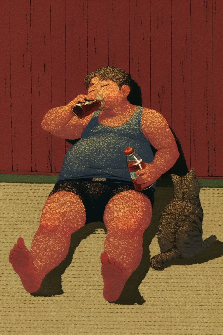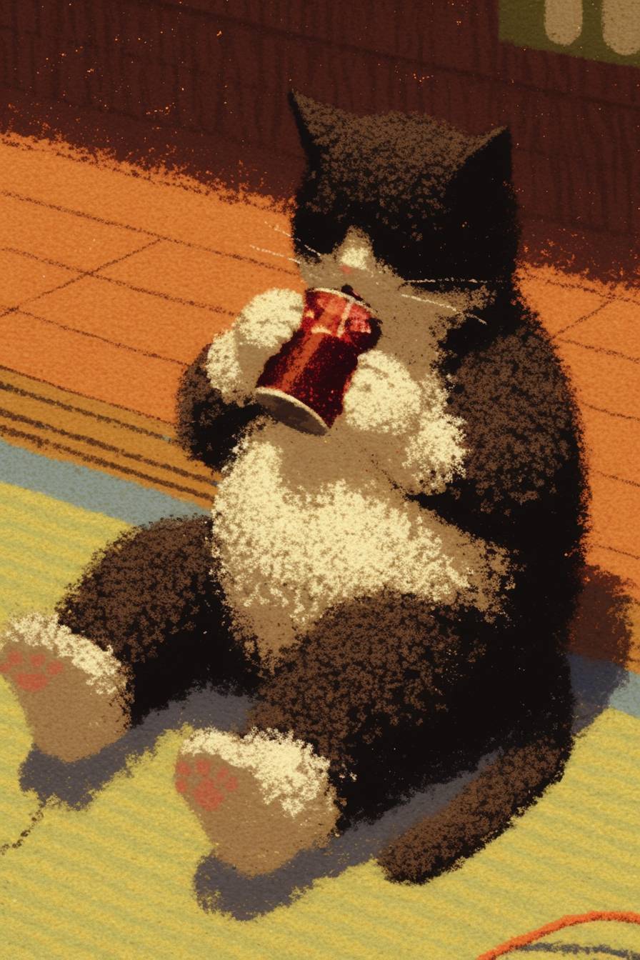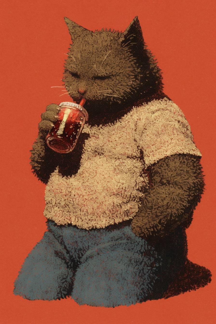 The fat cat drinks cola. --sref 943502692 --niji 6 --ar 2:3
