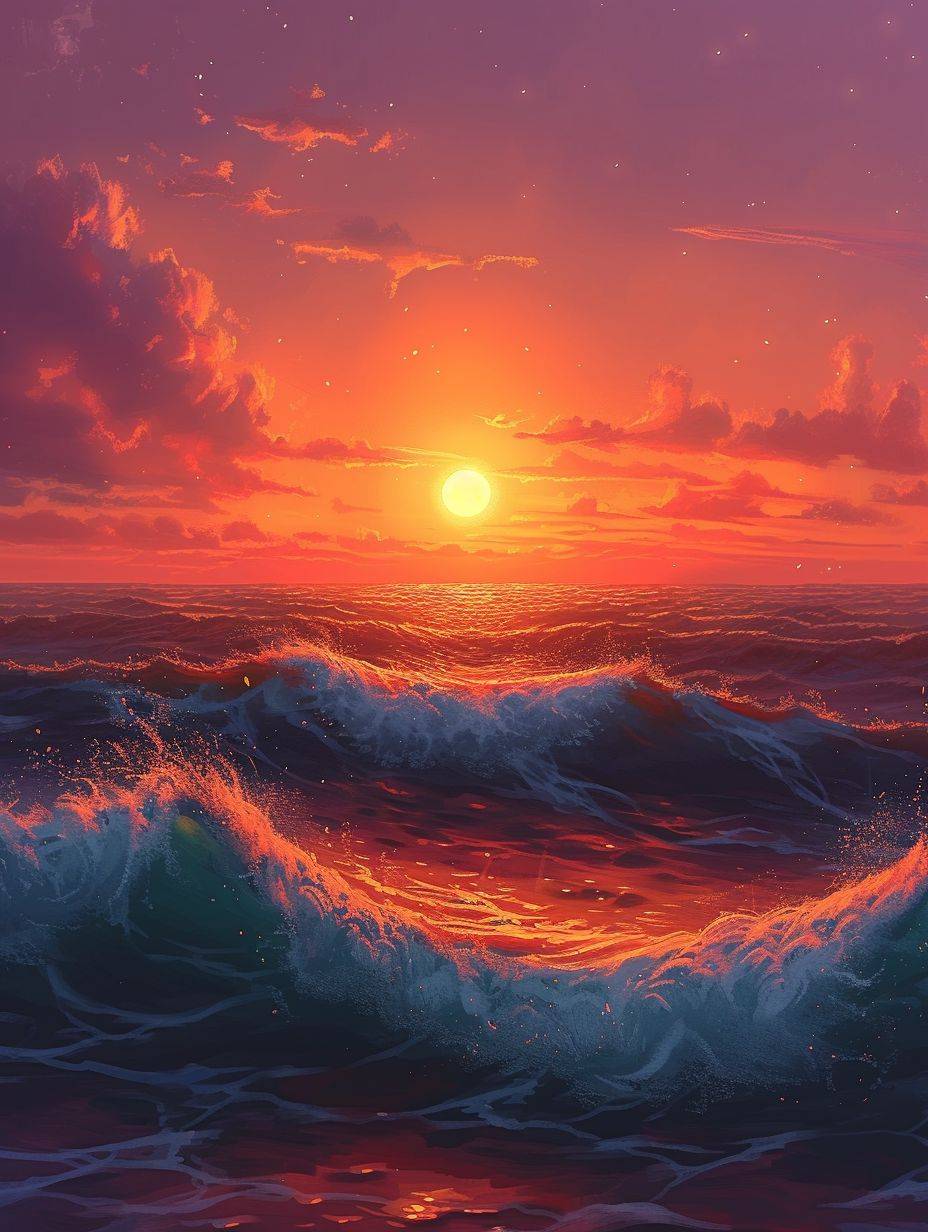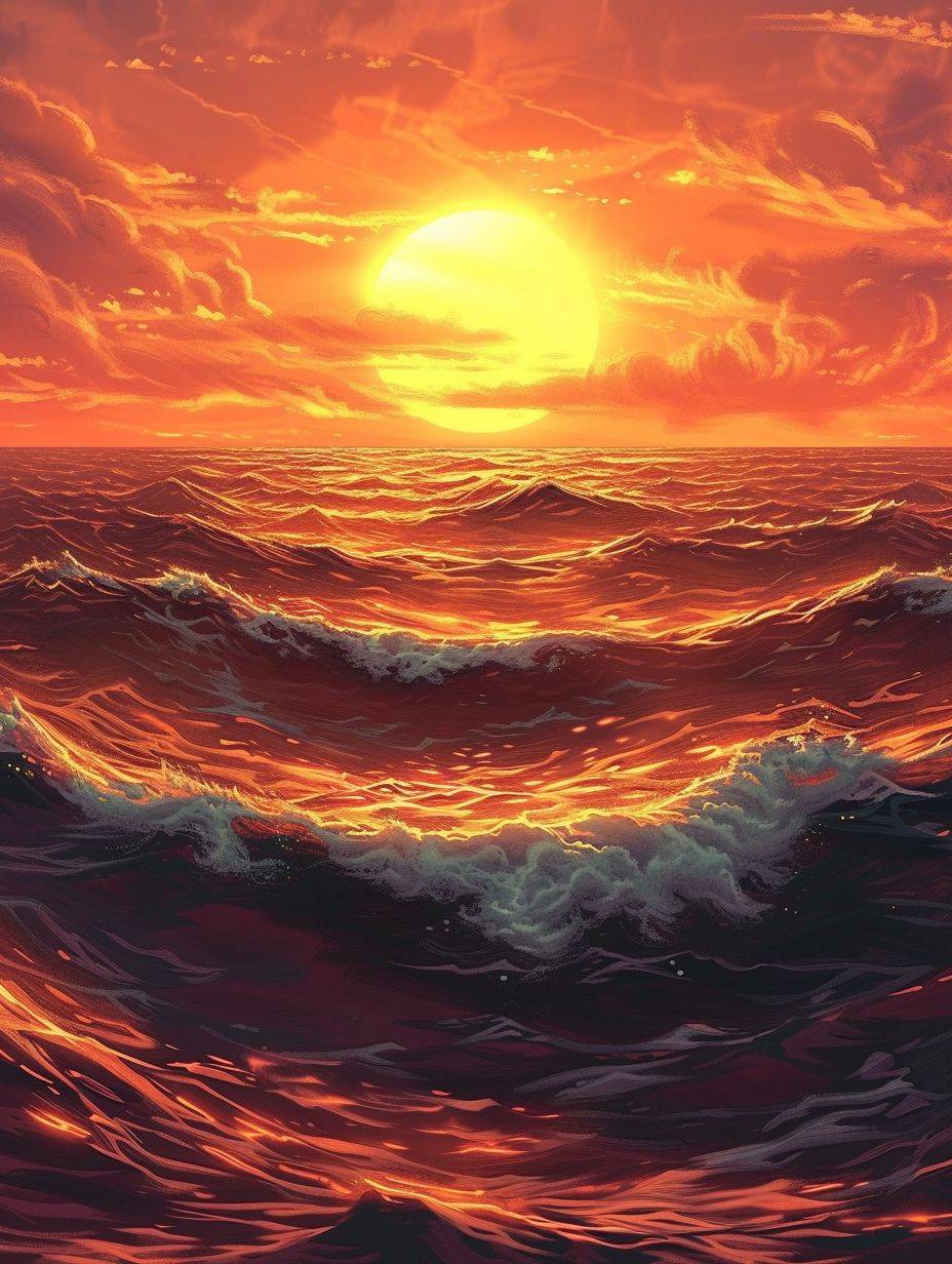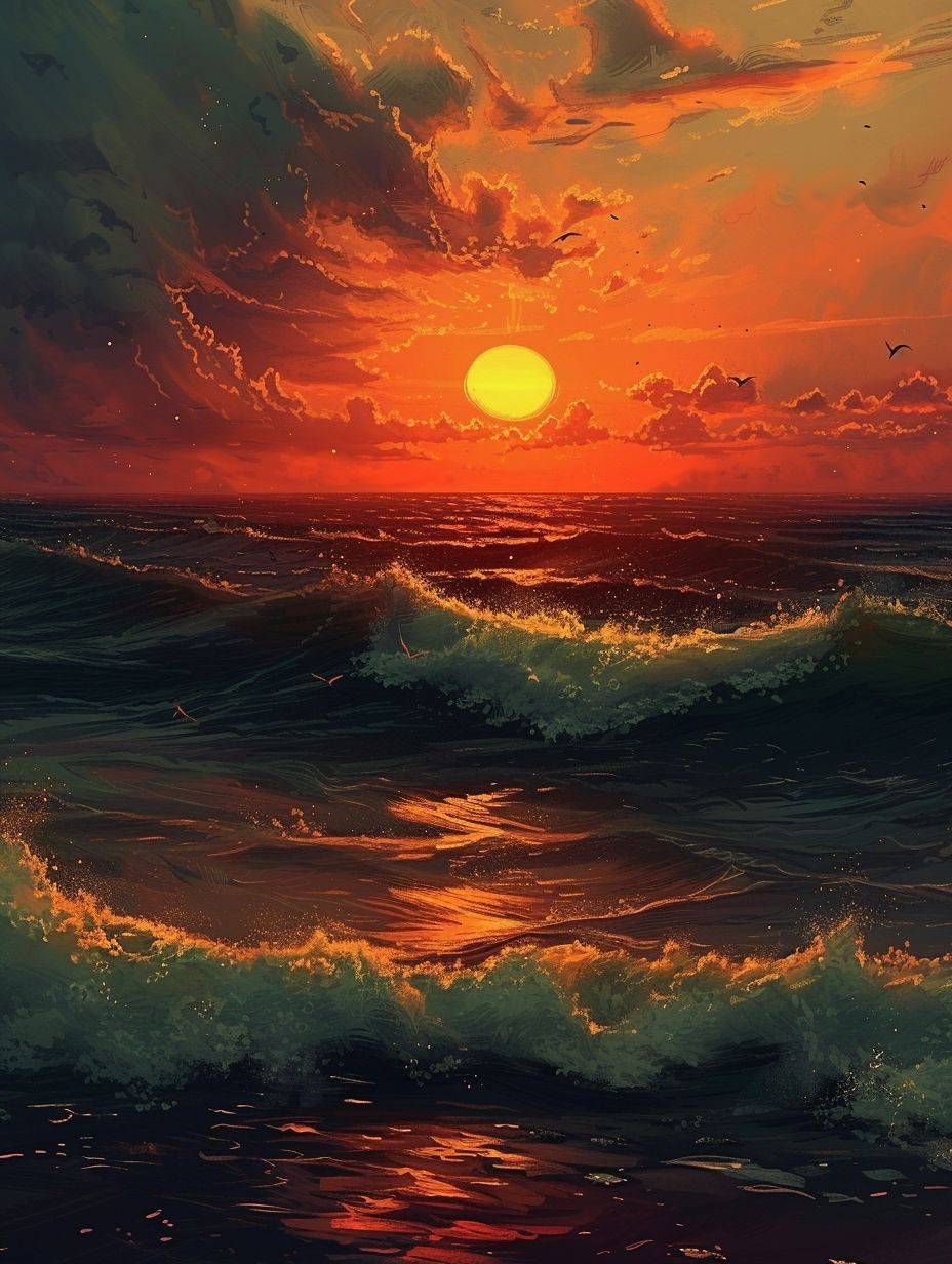 The golden sun sets on the horizon, casting its fiery glow over the rolling waves of the ocean,Alena Aenami style --ar3:4--v6