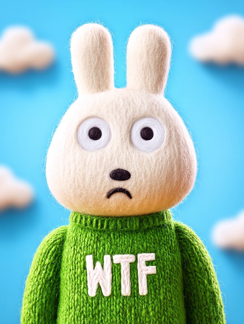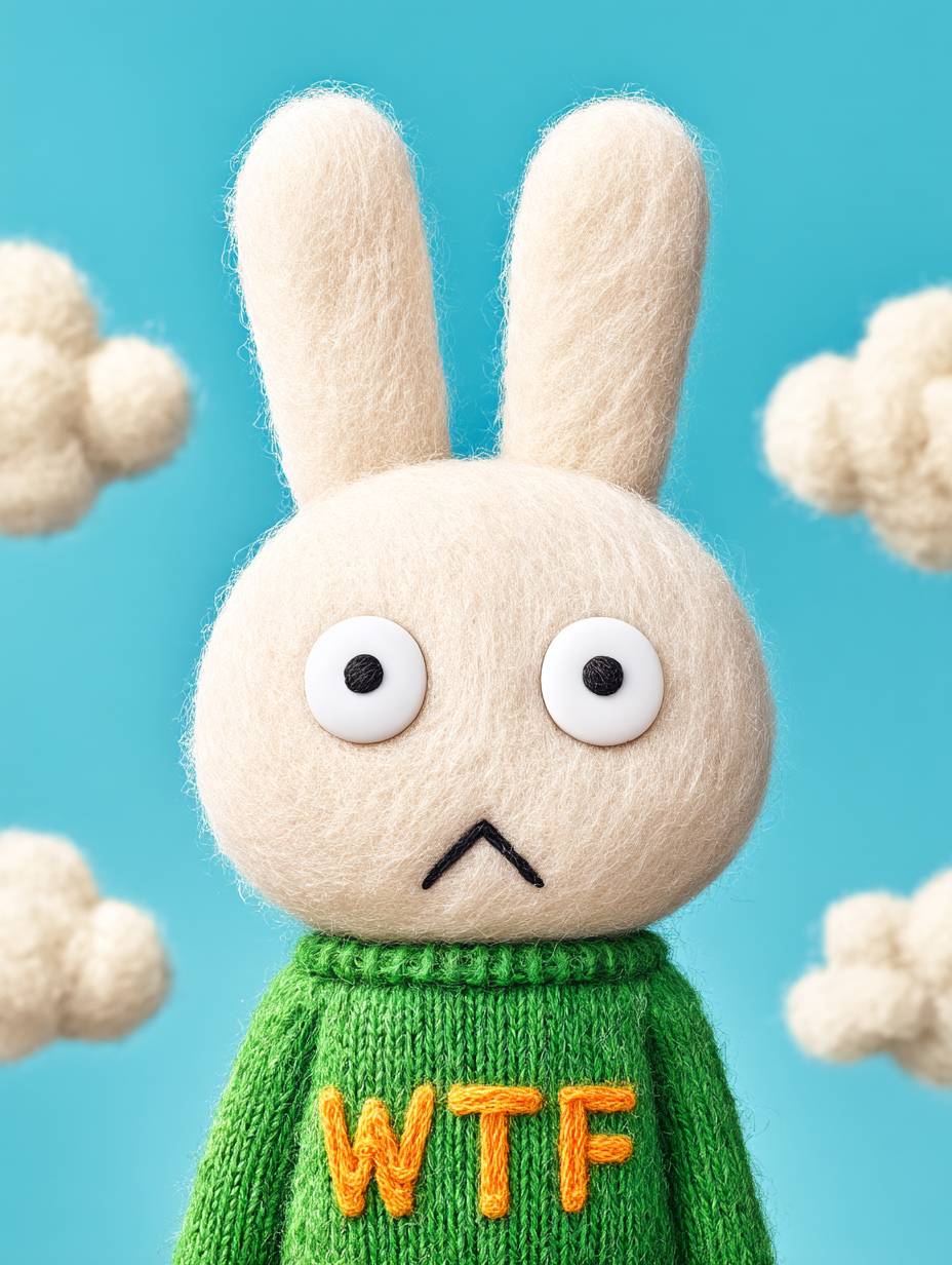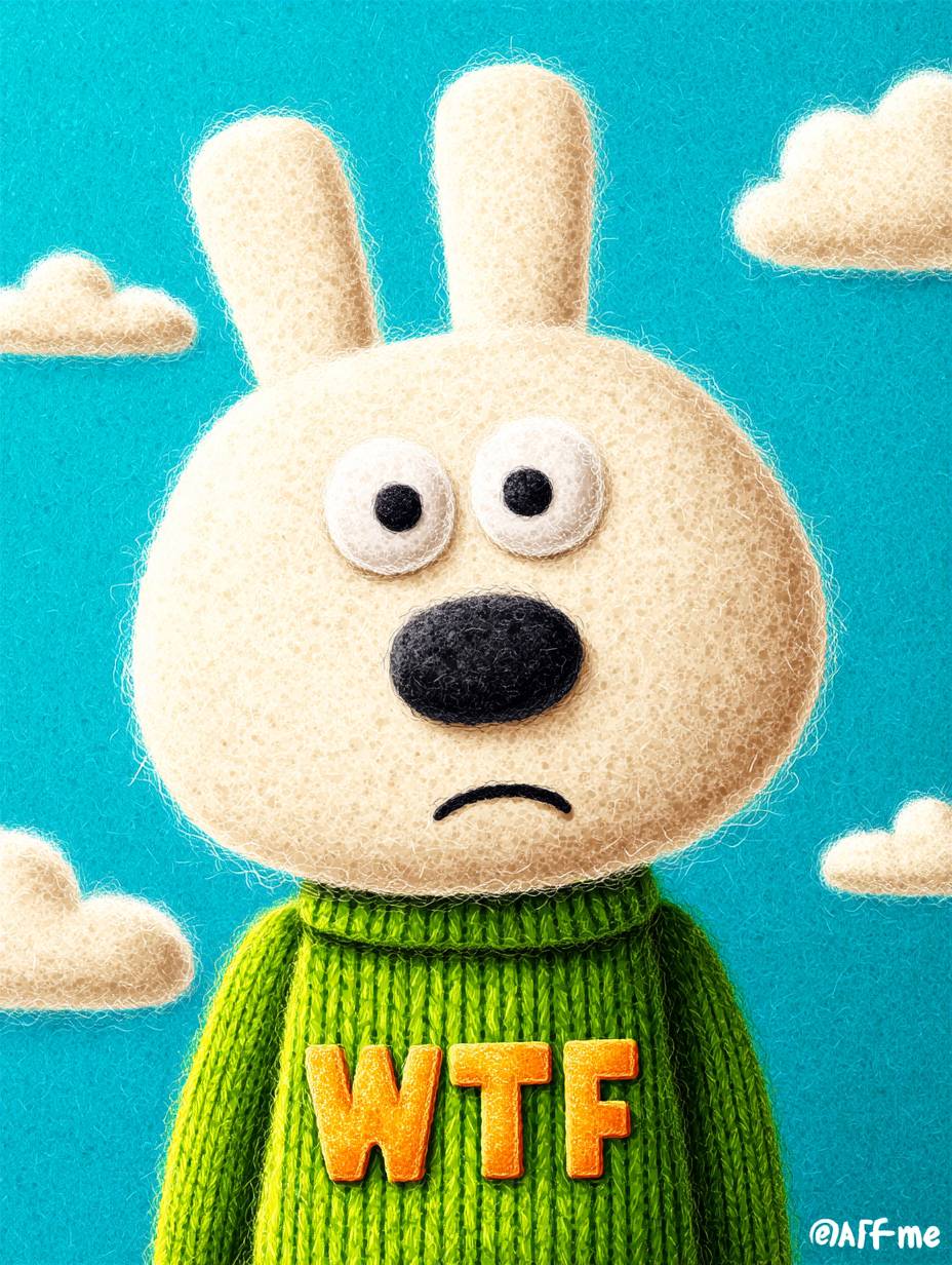 A close-up of a dog's head and shoulders, with big white eyes made of felt material, wearing a green sweater woven in roving, with the letter 'WTF' on its chest and a blue sky and white clouds in the background. This high-quality illustration captures the cuteness and playfulness of Miffy's world.
