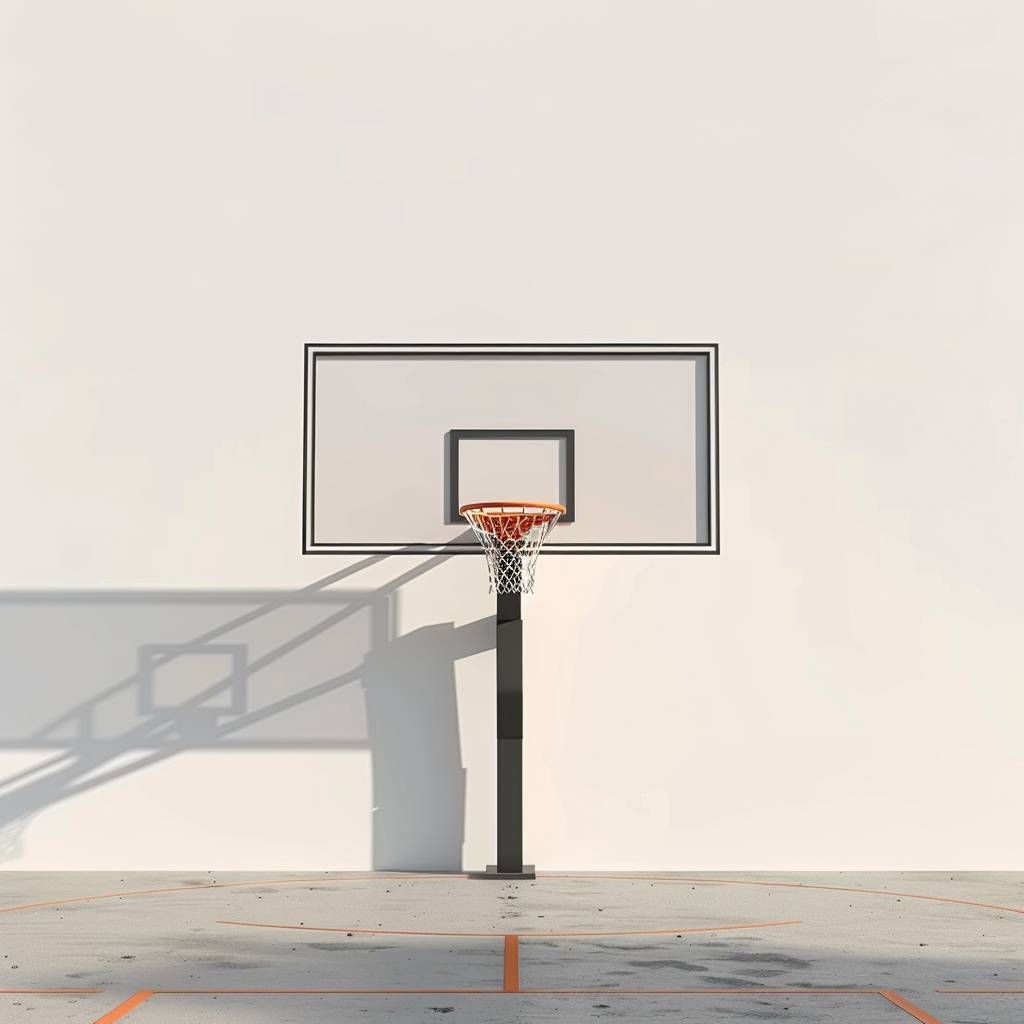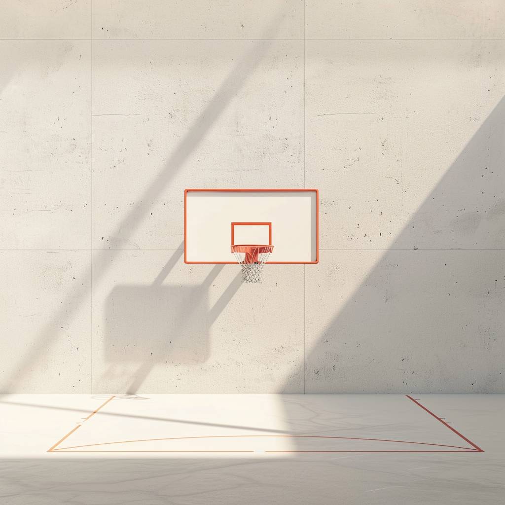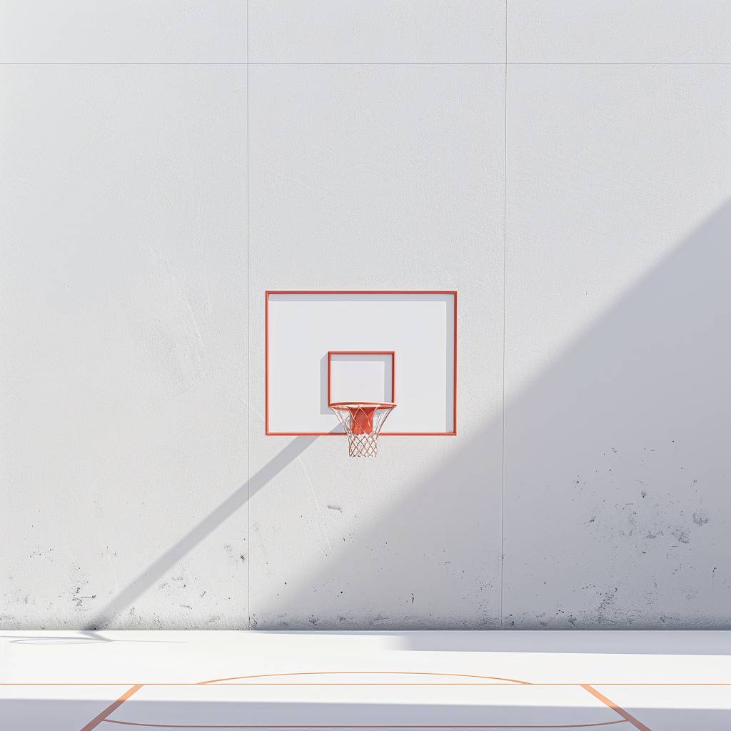 A modern, clean 3D render of a basketball hoop with a white wall background, bright natural sunlight highlighting simplicity and vivid details.