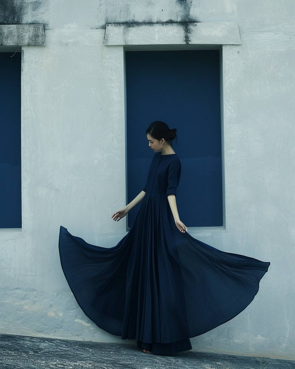 A girl in a dark blue shirt holds the ends of her wide skirt in her hand, making it create a semicircle. The skirt is dark blue. The girl stands against a white wall between two large dark blue windows raised above street level. photographic style Wes Anderson fashion and glamour. --ar 4:5 --v 6.0