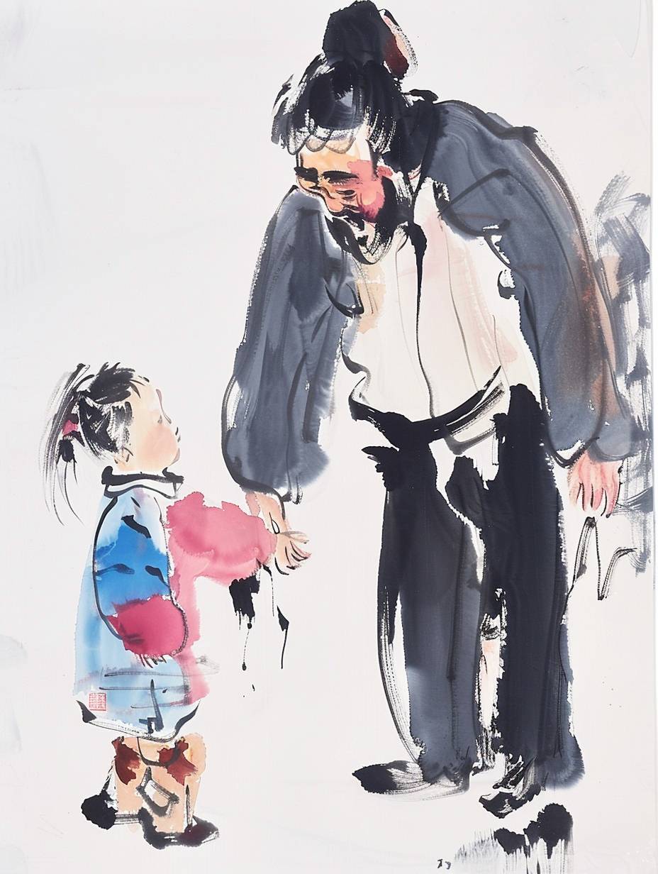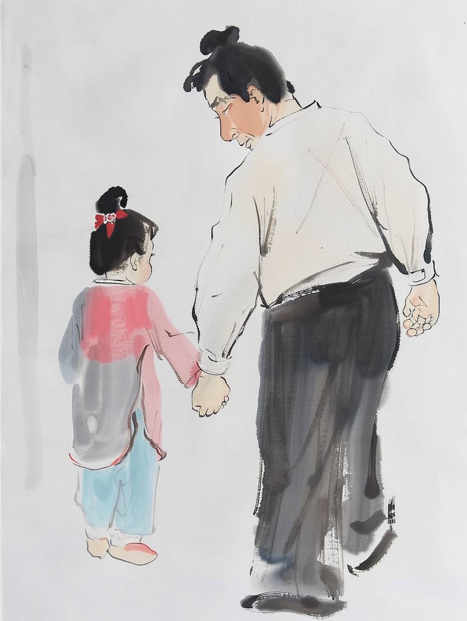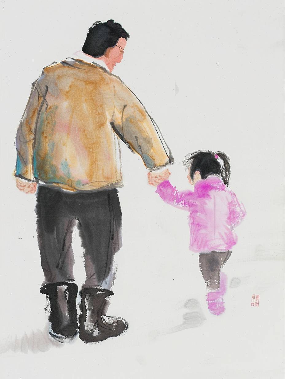A Chinese painting in the style of Wu Guanzhong depicting a father holding his daughter's hand, colorful and simply composed.