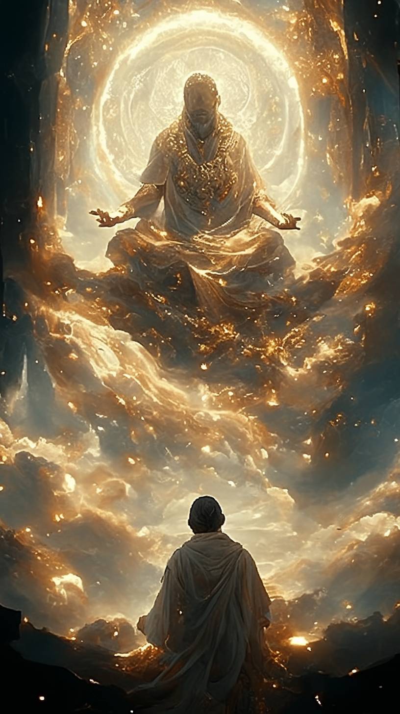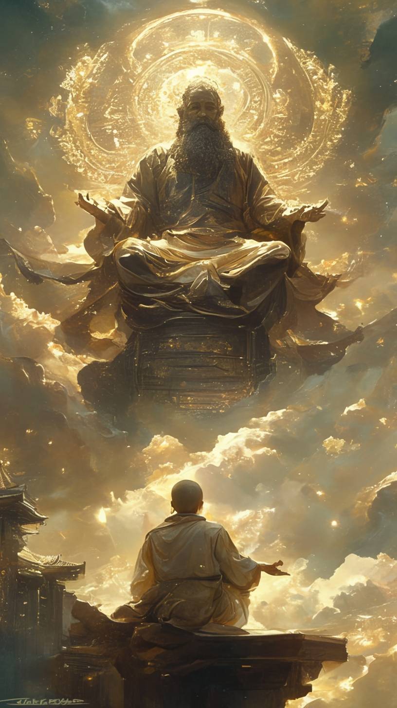A Buddha statue sitting in lotus position, facing a bearded ancient Greek philosopher wearing a white robe, both seated calmly on a floating platform in the clouds, surrounded by soft glowing light, creating an ethereal atmosphere that is serene and contemplative, with high detail, and a 9:16 aspect ratio.