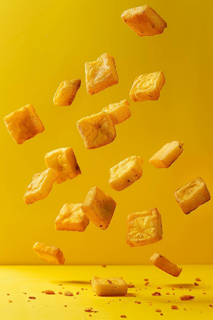 Marketing photography of croutons made of fried plantains floating in the air over a yellow studio background