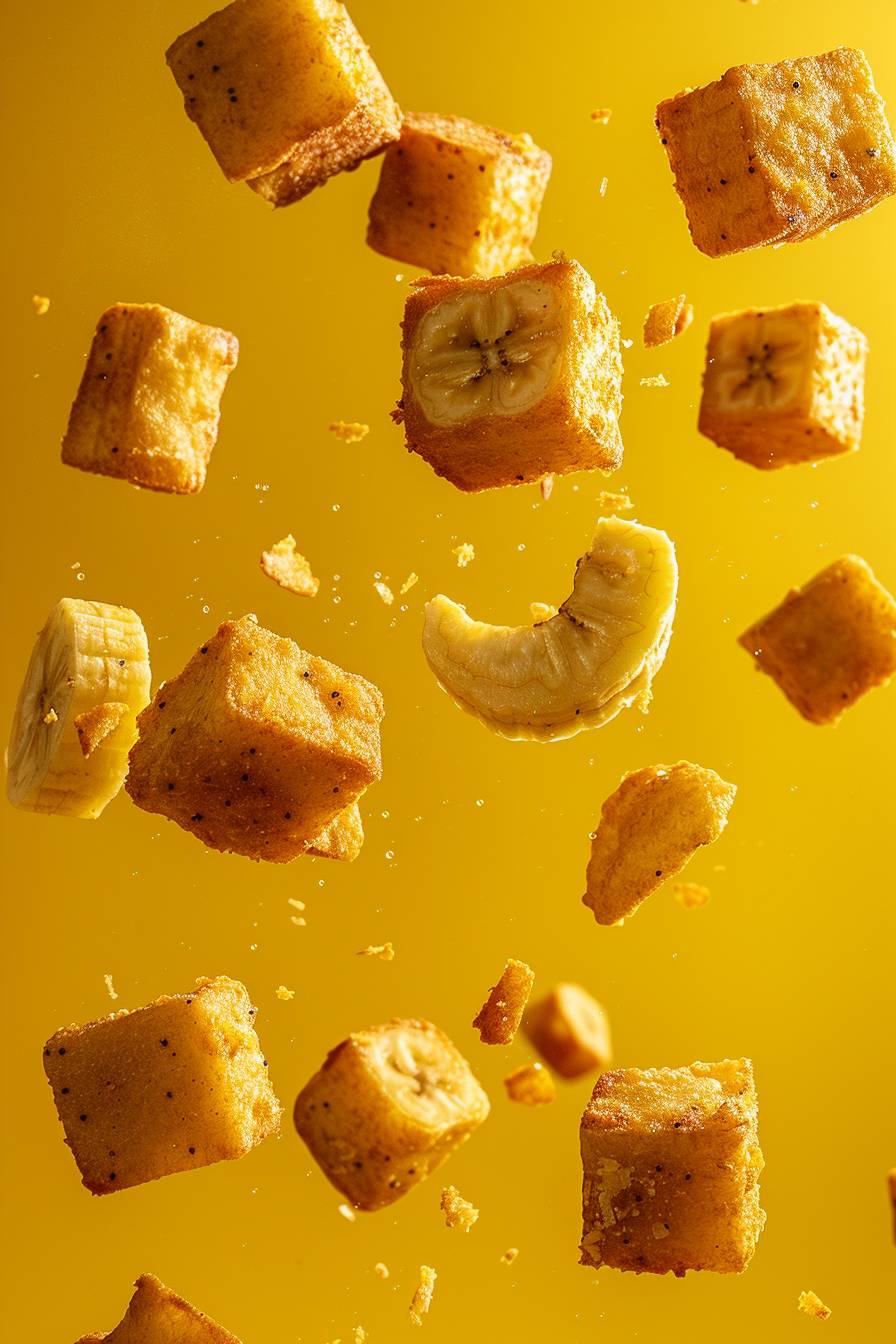 marketing photography of croutons made of fried plantains floating in the air over a yellow studio background, studio photography --ar 2:3 --v 6.0
