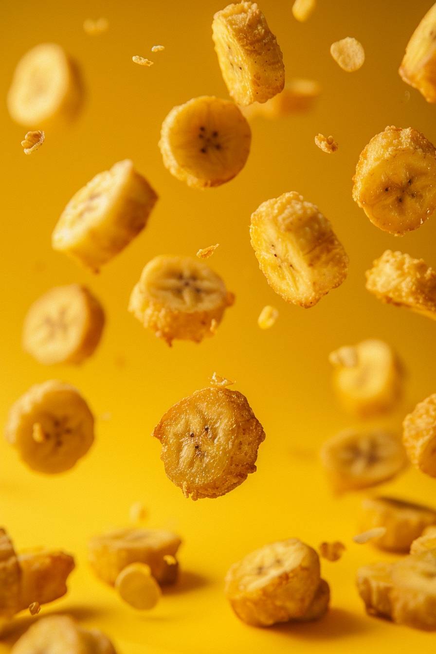 Marketing photography of fried plantain croutons floating in the air over a yellow studio background.