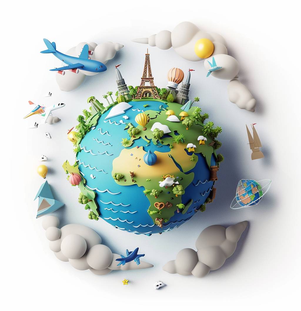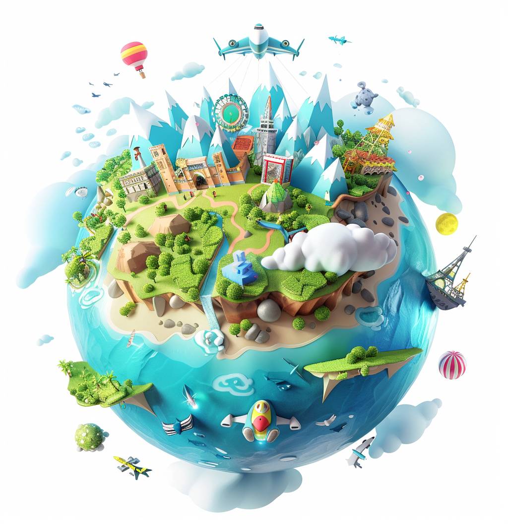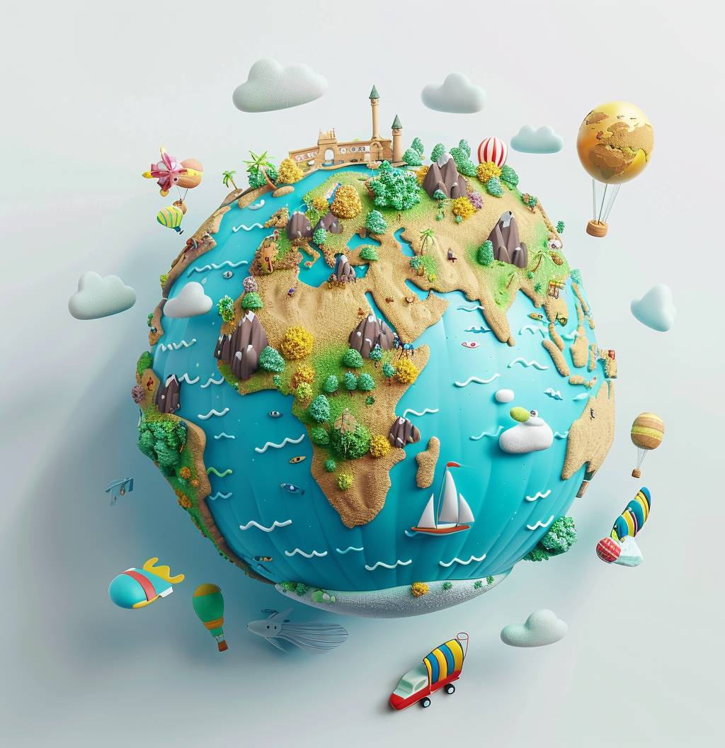 3D cartoon Earth showcasing various landscapes and travel icons on a white background, in the style of Pixar.