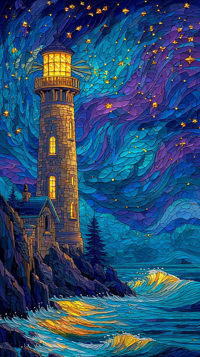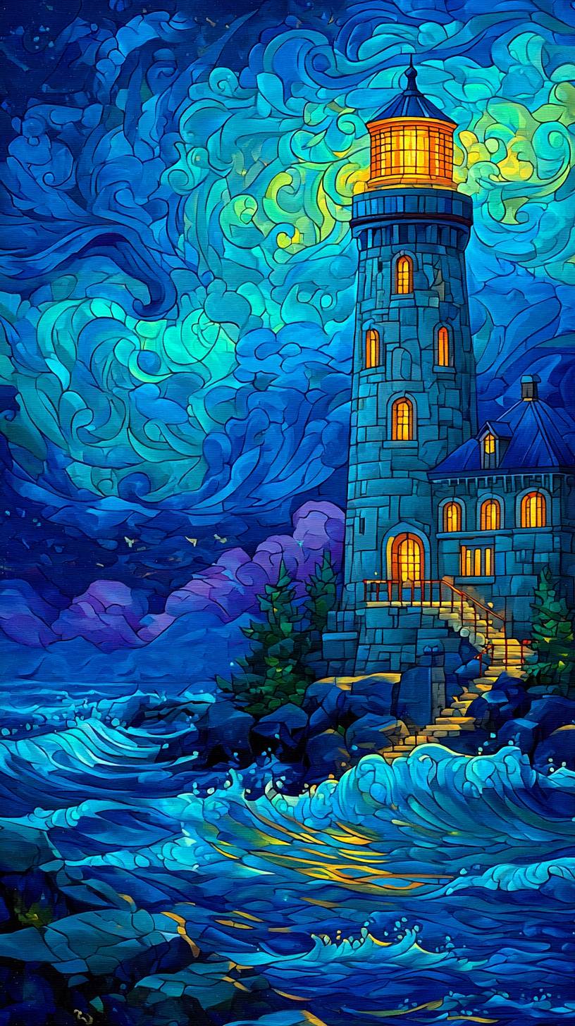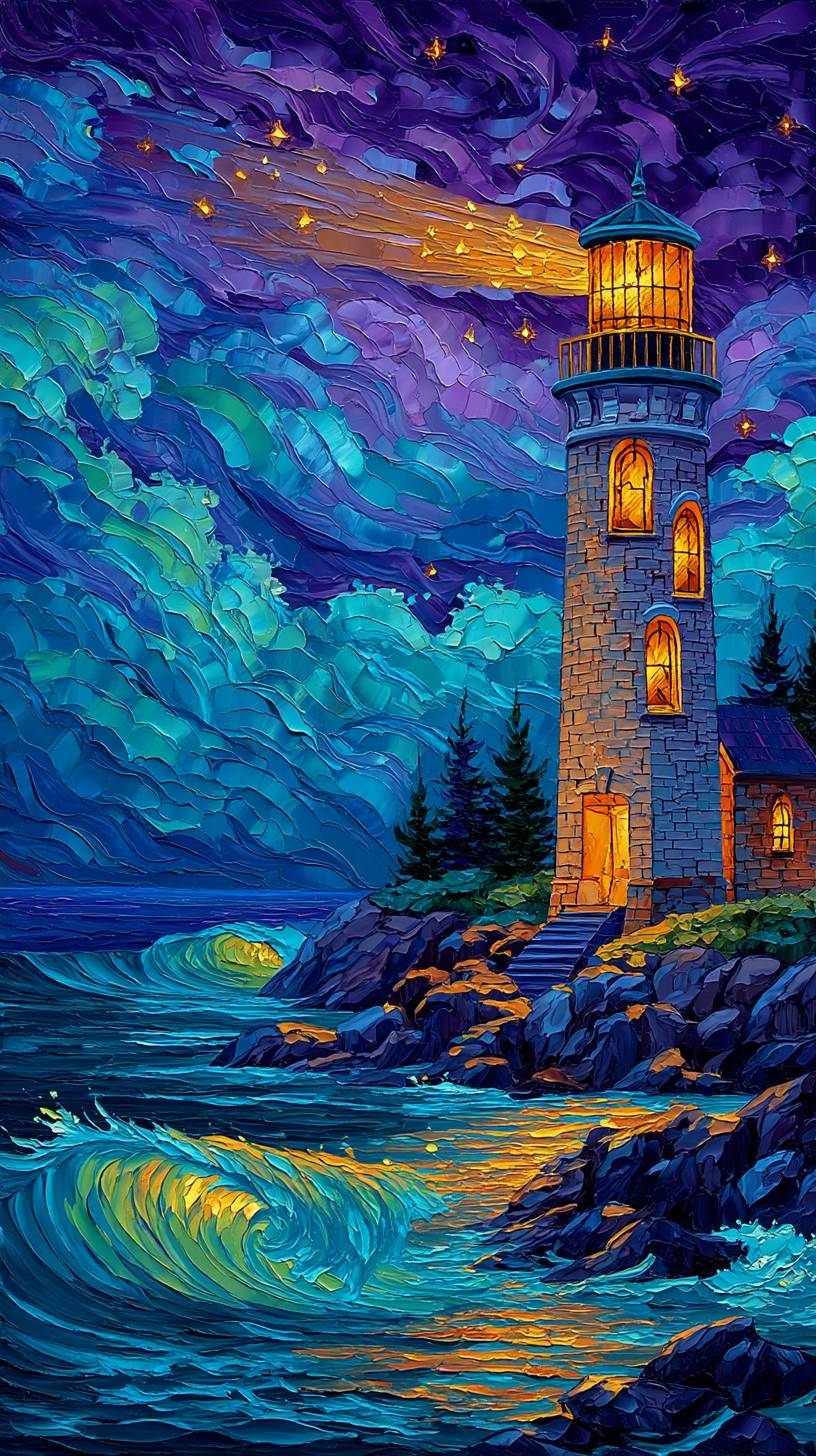 A oil on canvas painting with heavy brushstrokes of a towering lighthouse standing proudly on a rugged, rocky island as dark, churning waves crash against the shore. The lighthouse, a beautiful and ancient structure, features intricate stone carvings and a spiral staircase visible through its arched windows, emitting a powerful beam of light that cuts through the inky blackness of the night sky. Above, a swirling nebula of vibrant blues, purples, and greens illuminates the heavens, while the lighthouse's base is subtly outlined with a shimmering, ethereal glow.Beyond a beautiful and turbulent sea of infinite blue with big waves.The scene is atmospheric and dramatic, evoking a sense of magical wonder and timeless strength., Illustration, Cinematic, Oil Painting, Vibrant. --chaos 10 --ar 9:16 --raw --profile kji7p65 --stylize 650 --v 7.0