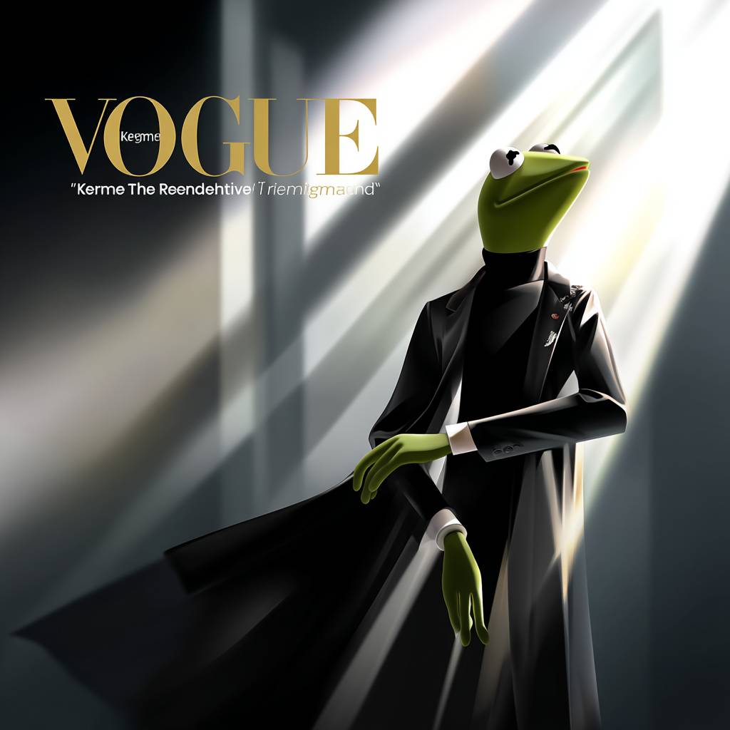 A close-up portrait of Kermit the Frog in a high-fashion black turtleneck, posed against a sleek white background with dramatic studio lighting casting sharp shadows. The magazine masthead 'VOGUE' is bold and gold at the top, with 'Kermit: The Icon Reimagined' in elegant serif font below.