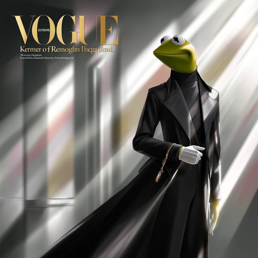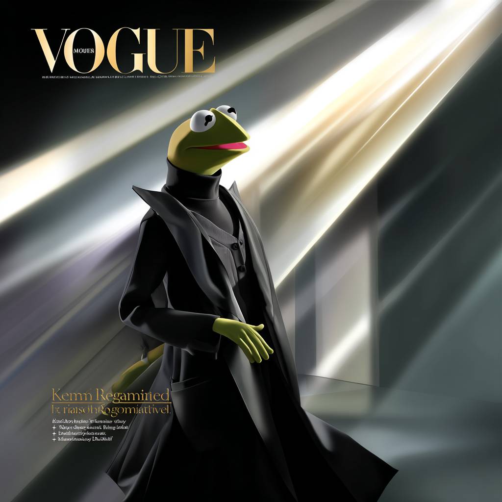 A close-up portrait of Kermit the Frog in a high-fashion black turtleneck, with the title 'VOGUE'.