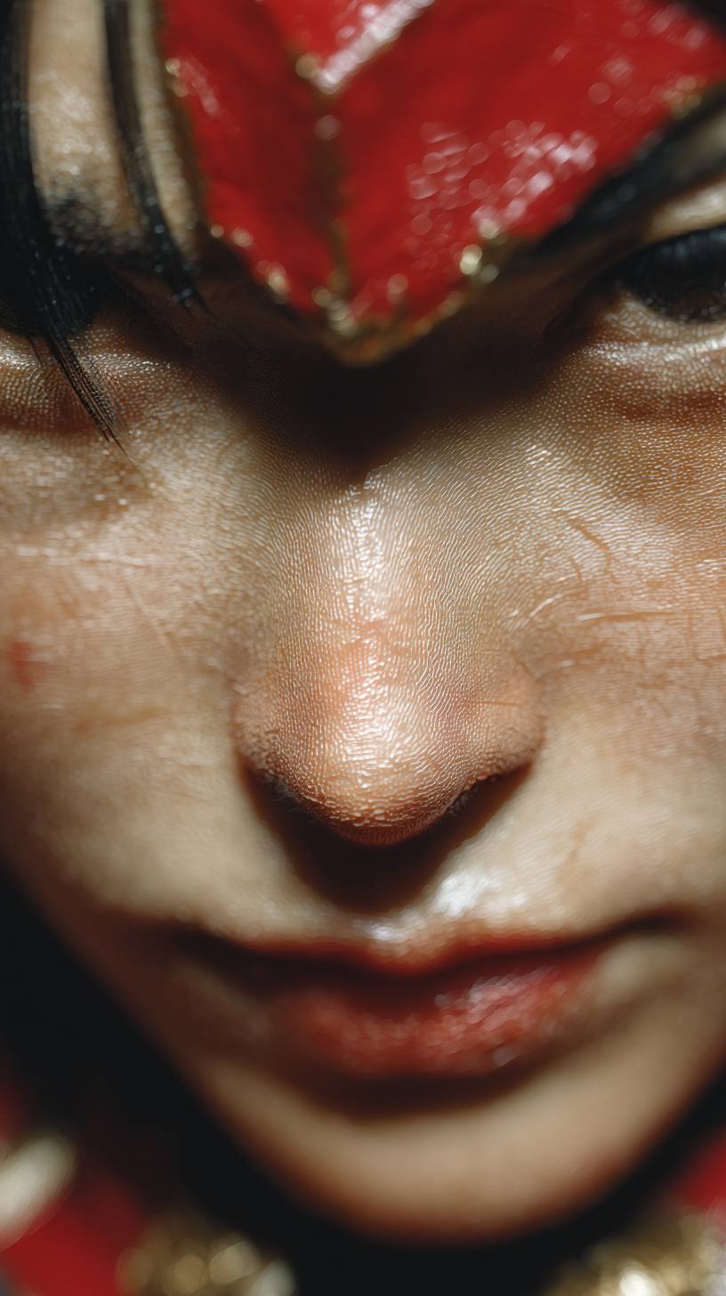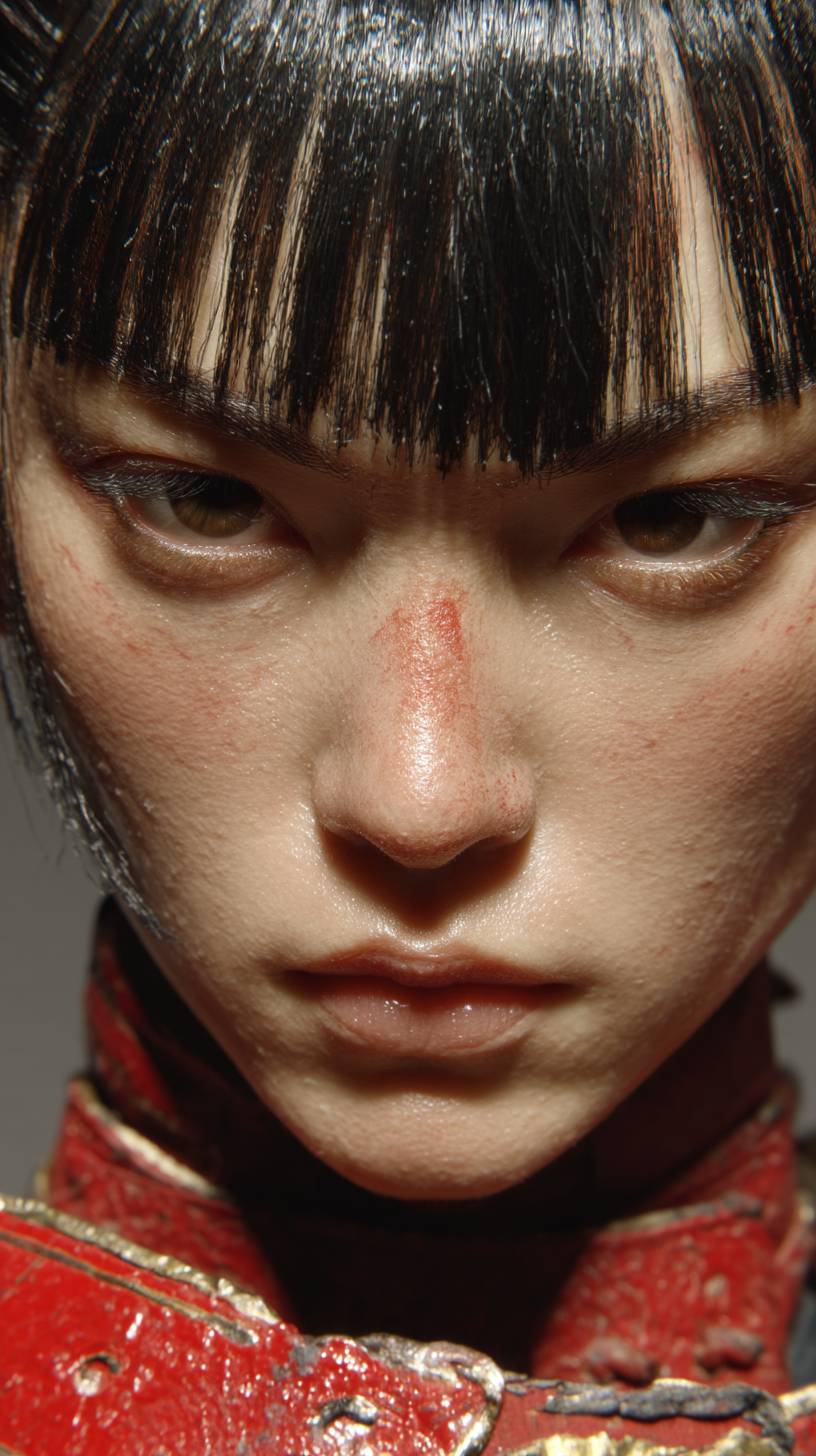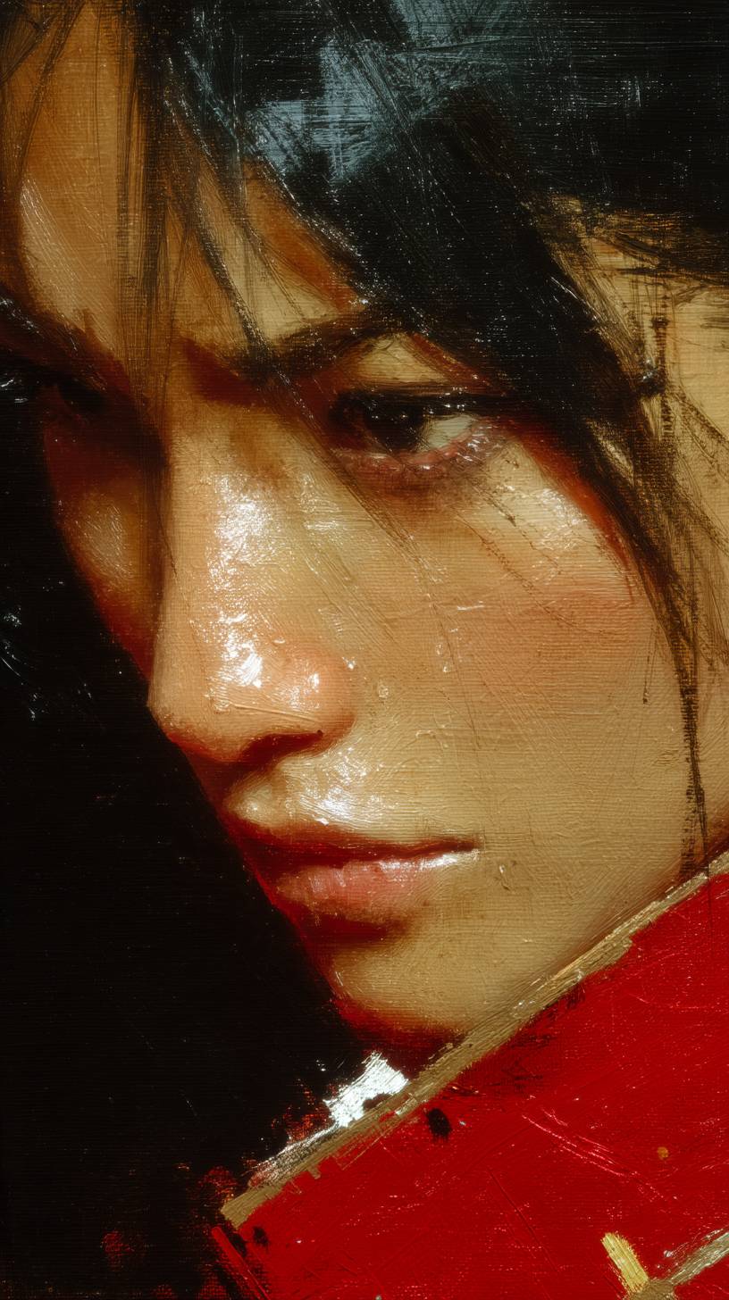 Depict her as an elegant warrior with traditional Chinese armor elements subtly incorporated into her attire. She could have a sleek, red silk robe with gold accents and flowing black hair tied in a high ponytail. Her expression can convey a warrior's grace mixed with deep melancholy., with detailed and perfect lighting, and high detail, in the style of Artgerm --chaos 20 --ar 9:16 --profile 5rij2pe --stylize 1000 --v 7.0