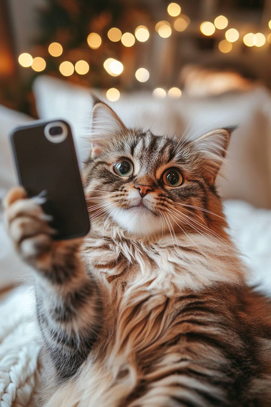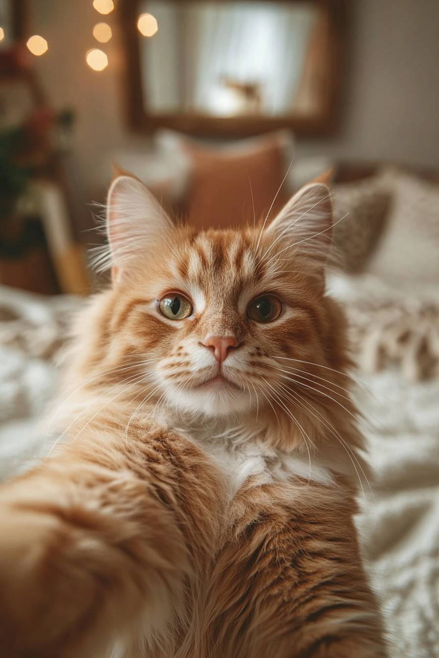 A fluffy Maine Coons cat taking a selfie, realistic photography style, soft natural lighting, vibrant cat fur details, expressive cat eyes, cozy indoor setting, shallow depth of field