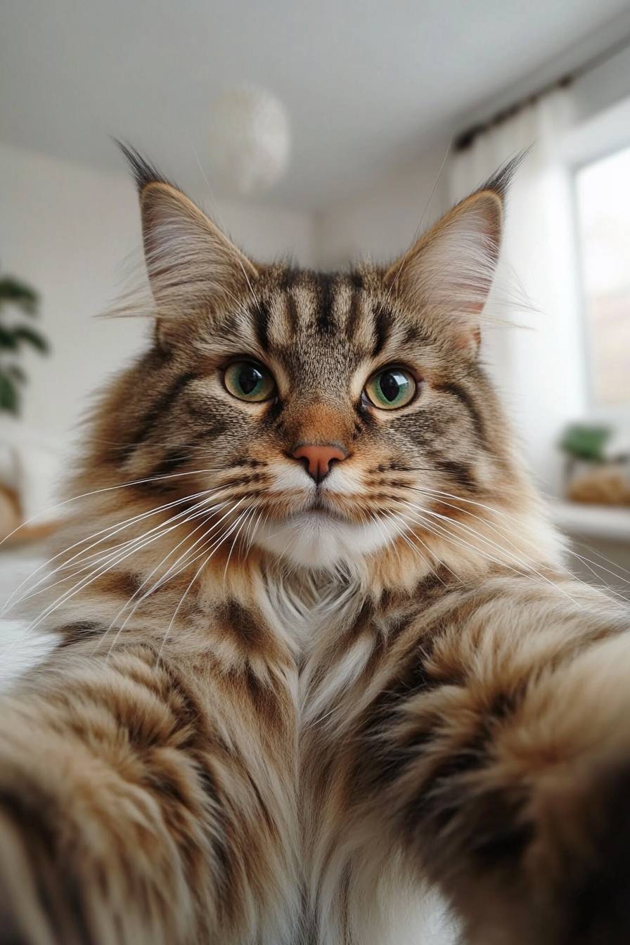 A fluffy Maine Coons cat taking a selfie with realistic photography style and natural lighting.