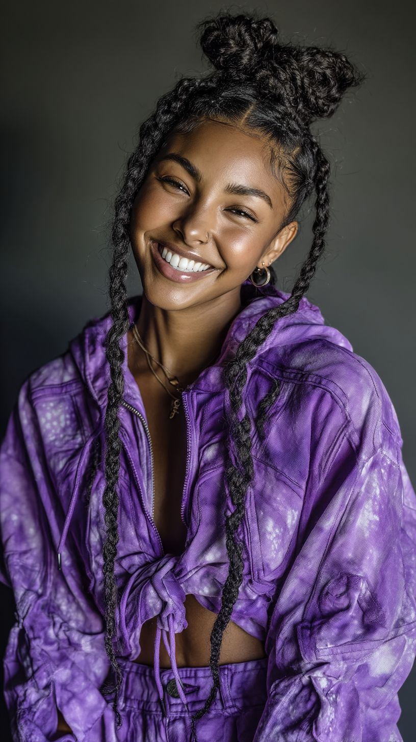 A 30-year-old black girl is smiling in a trendy acid wash hoodie, showing off her long braided hair in a studio setting.