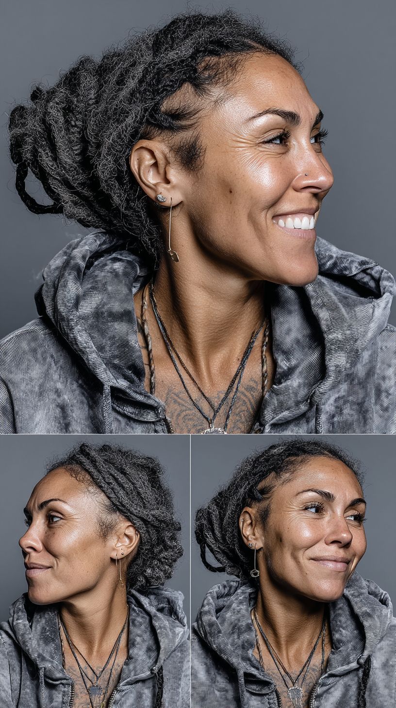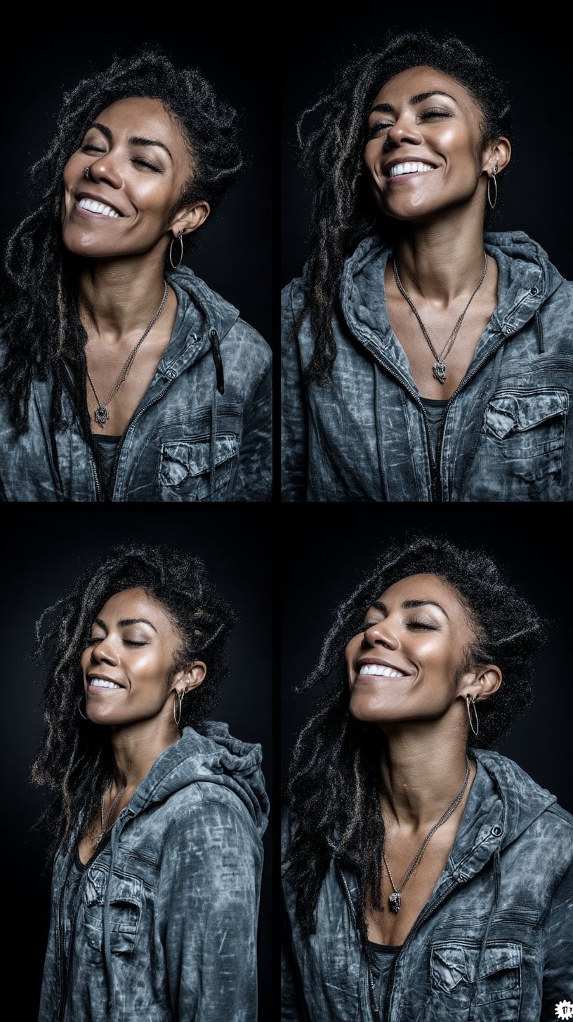 Photo type: character sheet, split into 4 photos, shot from multiple angles, Subject: 30 year old black girl smiling, with long braided hair, beautiful skin, wearing: trendy acid wash hoodie,, setting: studio, image type: 70mm portrait, high precision --chaos 25 --ar 9:16 --stylize 550 --v 7.0