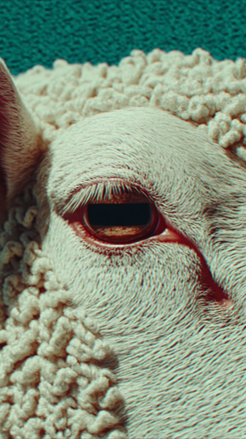 Extreme close-up of a sheep's eye, only one eye visible, hyper-detailed wool texture, realistic reflection in the eye, natural light, ultra photorealistic, cinematic lighting, fine hair strands, soft depth of field, sharp focus on eye --chaos 100 --ar 9:16 --raw --profile q7ir9rj --stylize 1000 --v 7.0