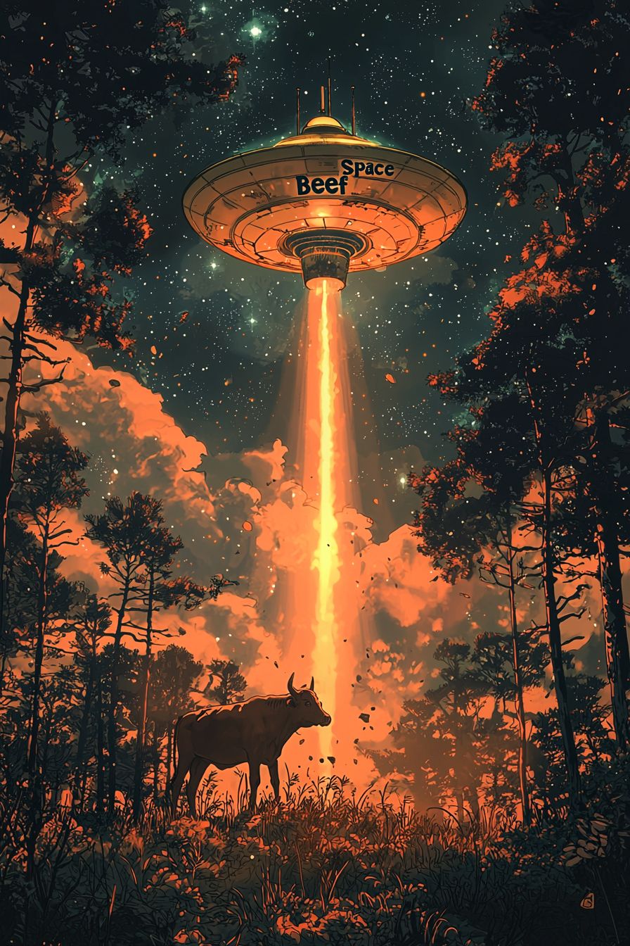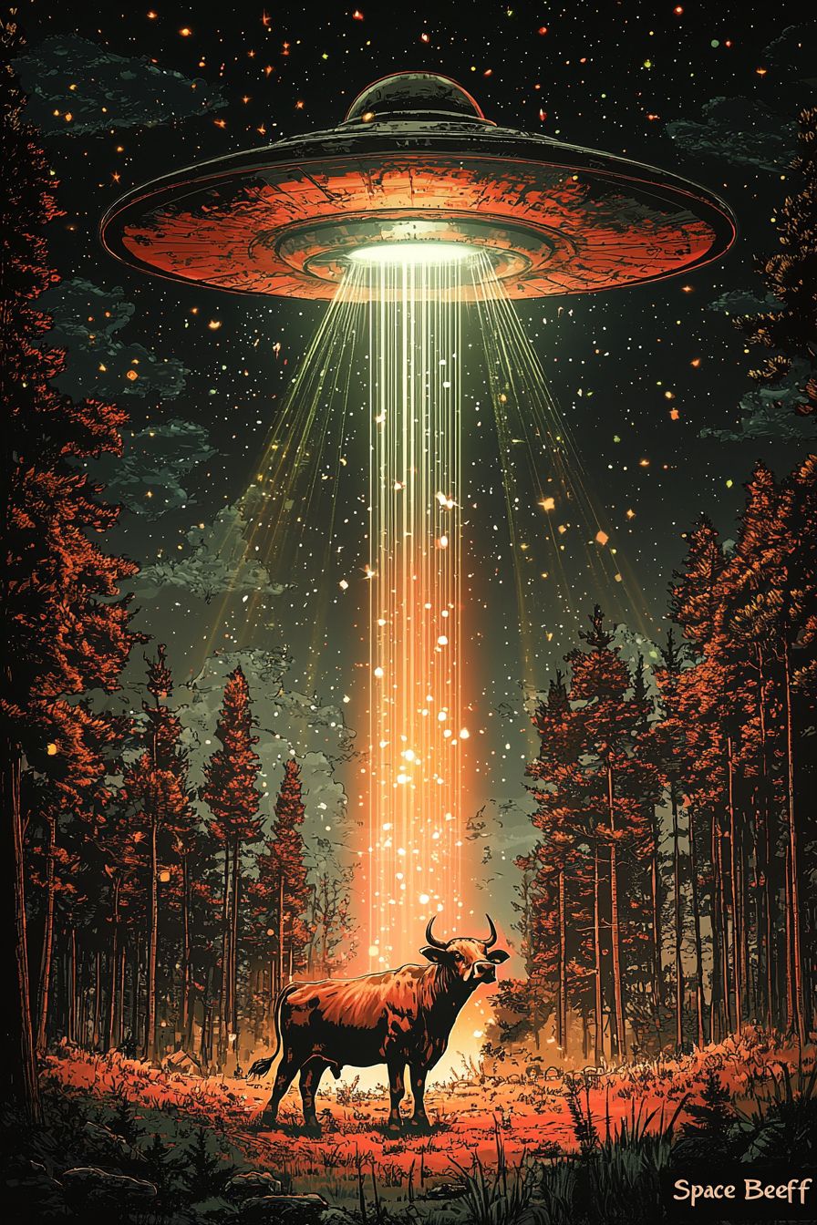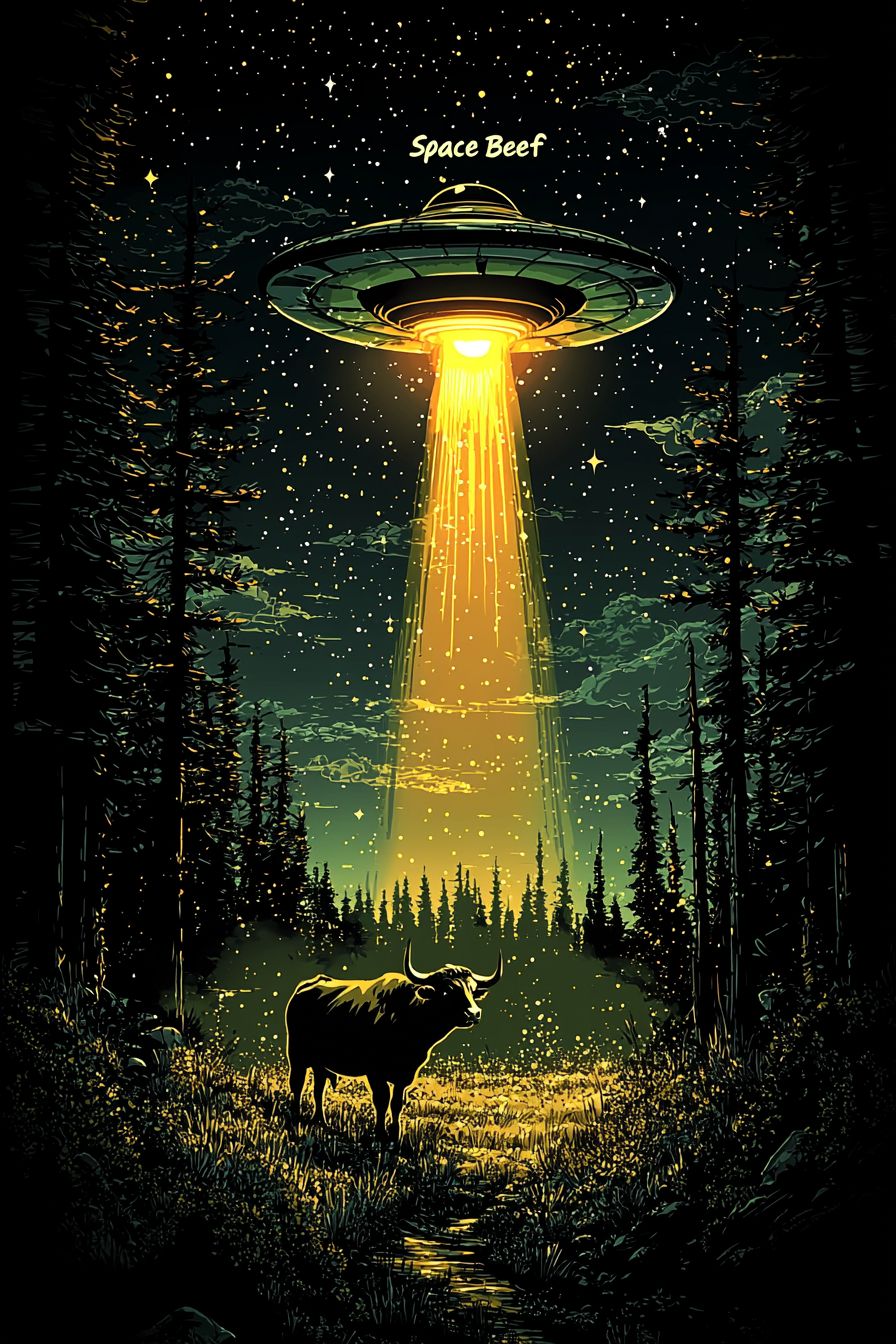 A comic book cover of a flying saucer beaming up a cow in a field with its green tractor beam, with text saying "Space Beef" In retro font. retro 1980s pulp sci-fi horror. illustrated as a professional tshirt illustration. Stylized. Fun, very colorful, funny. Close attention to detail, very detailed with clean details. black background --chaos 15 --ar 2:3 --stylize 878 --q 2 --v 6.1