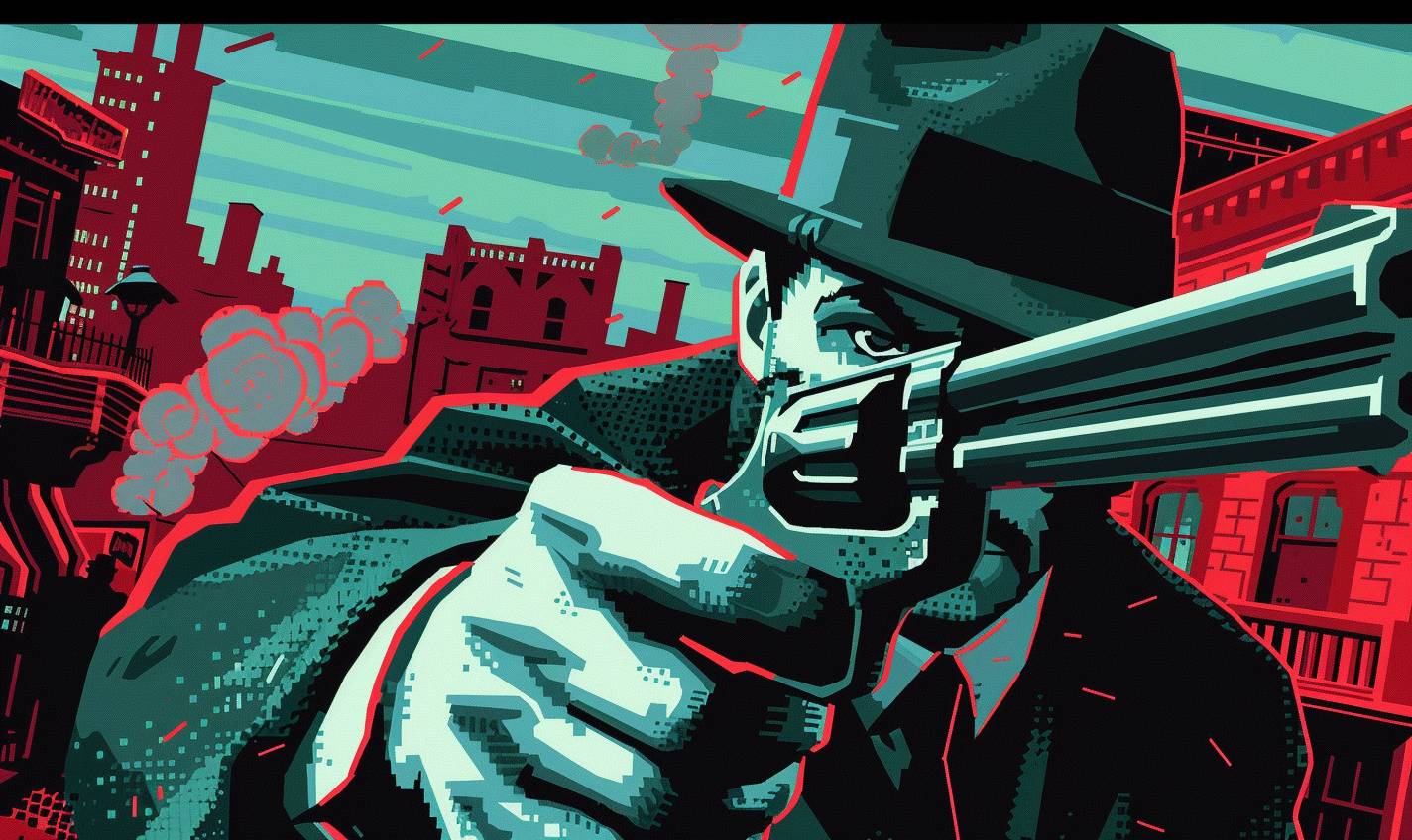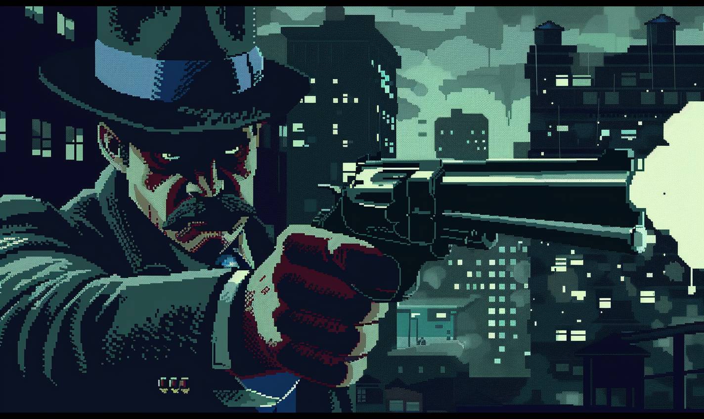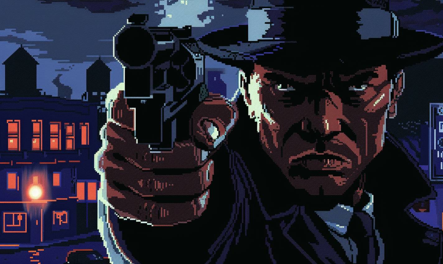 An 8-bit pixel art close-up of a ruthless gangster with a fedora holding a tommy gun, set against a 1920s city and speakeasy background.