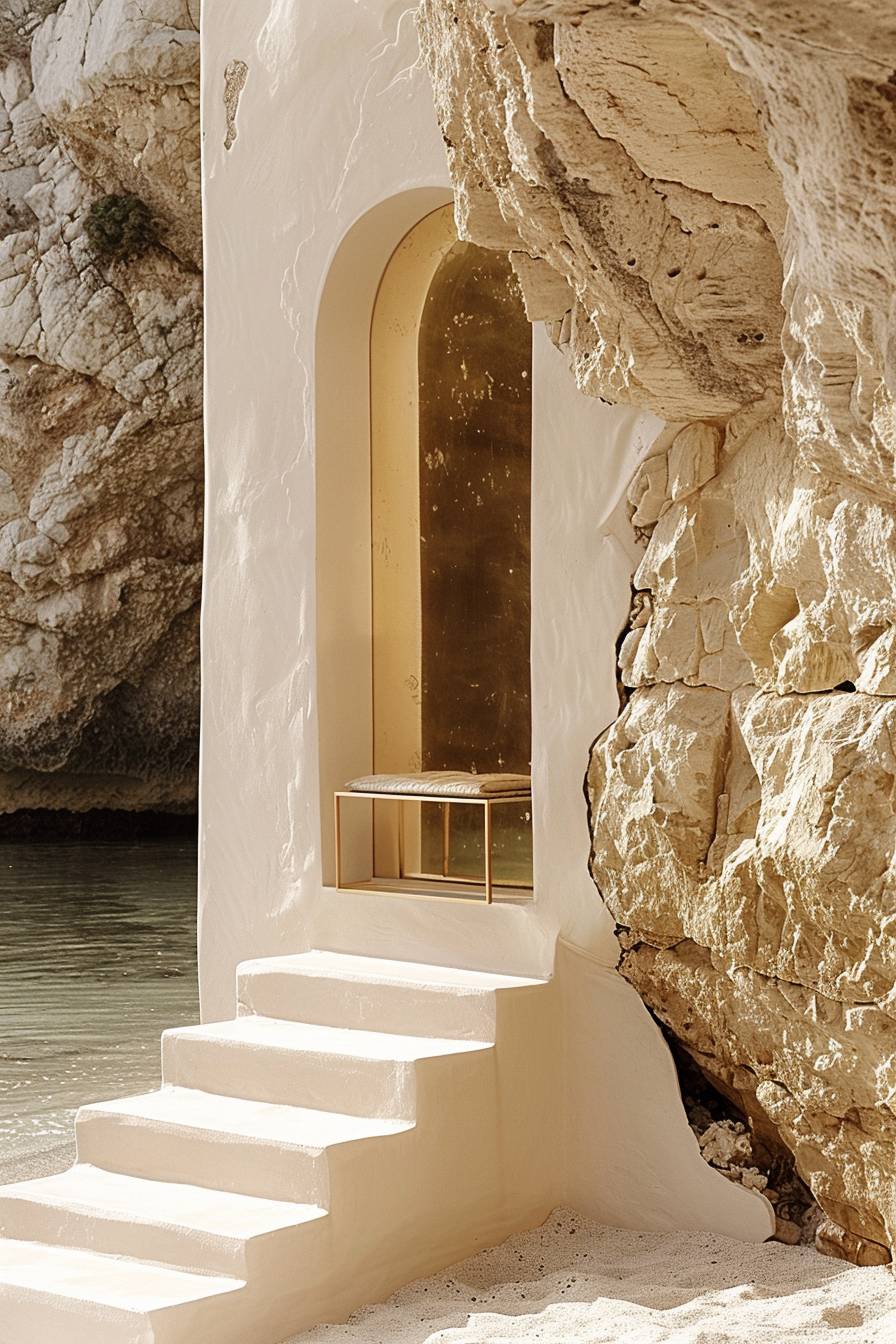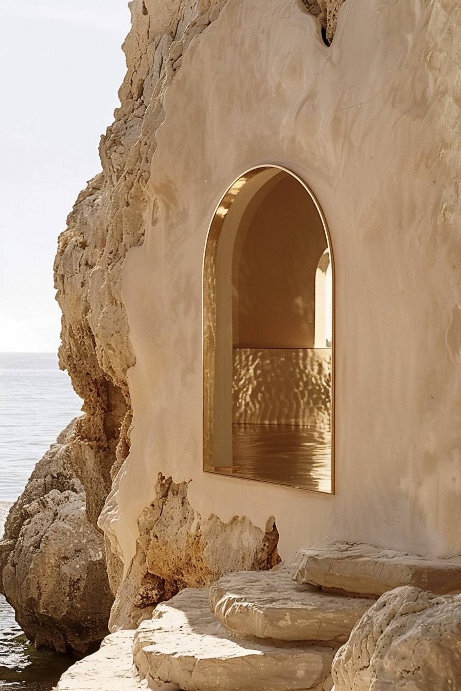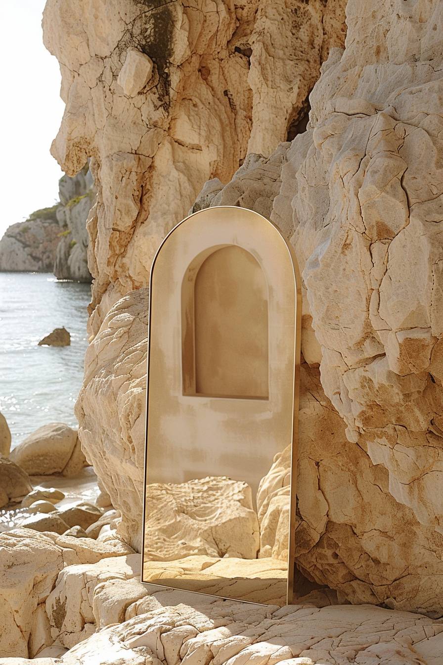 photo of a of a small pink mirror, a scenographic architecture, minimalist limestone rocks architecture, carved in rock, merging to the rocks, blending to the rocks, coastal, light beige and azure, golden hour, kodak portra 400 --ar 2:3 --style raw --sref 1751306882 --stylize 300 --v 6.0