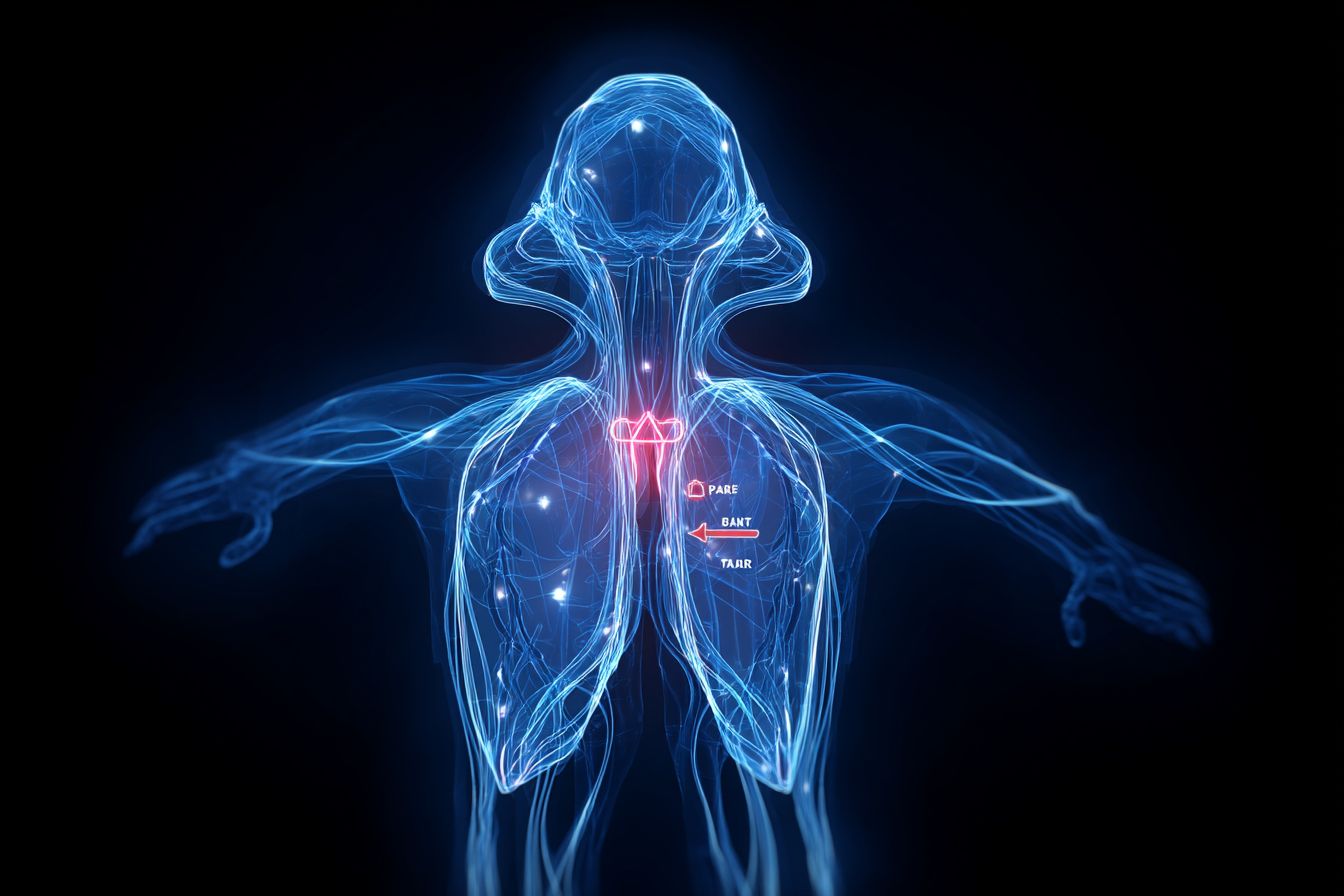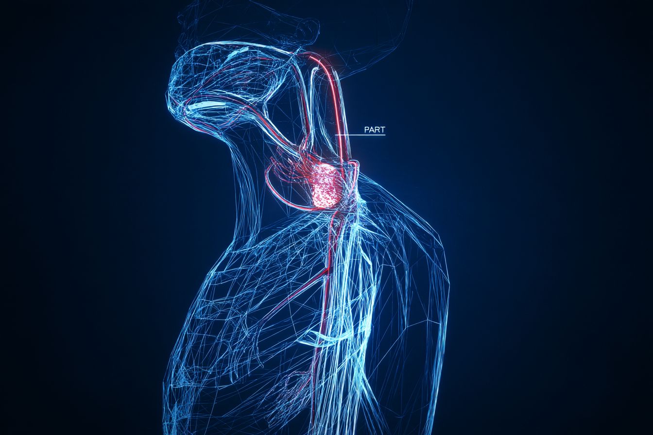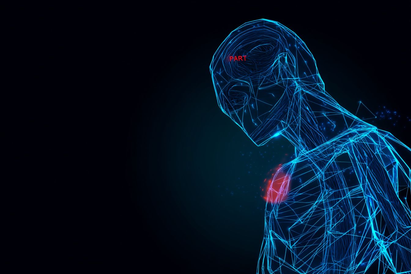 A digital illustration of a [SUBJECT] outlined with glowing blue lines against a dark background, with a [PART] highlighted in red.