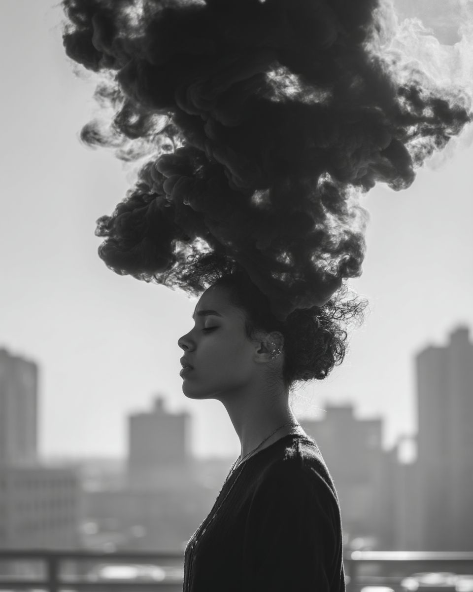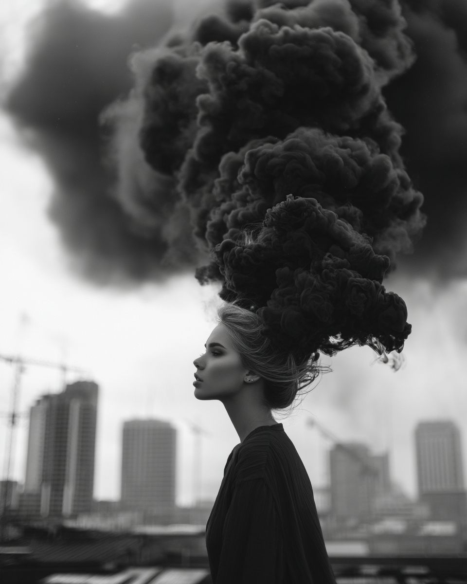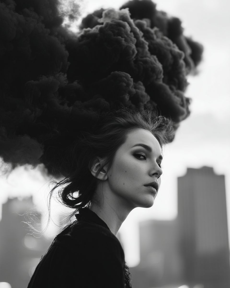 A black and white portrait photo of a young woman with very thick black smoke instead of hair, the thick black smoke blowing high above her, with a city skyline in the background, depth of field, and a cinematic feel.