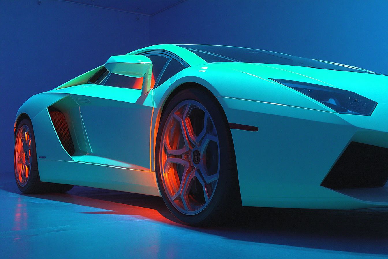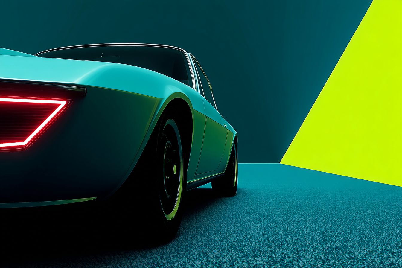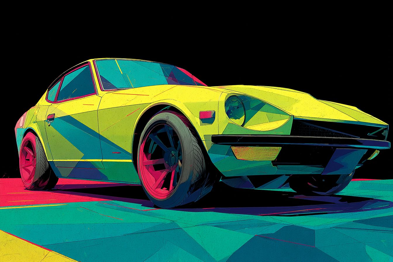 Sports car as a geometric abstraction with sharp angles and bold neon colors creates a dynamic and eye-catching composition.