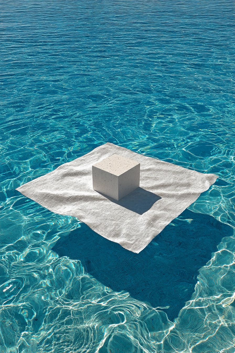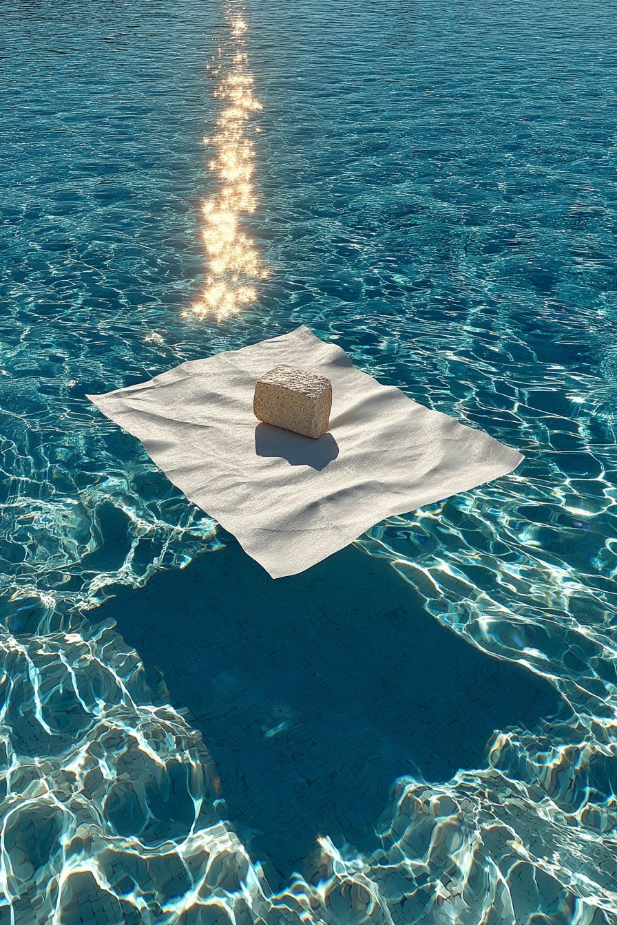Top view, blue ocean, [PROMPT] placed at the center on a white thin sheet cloth laid on the clear water, floating, volumetric lighting, shadows, depth of field.
