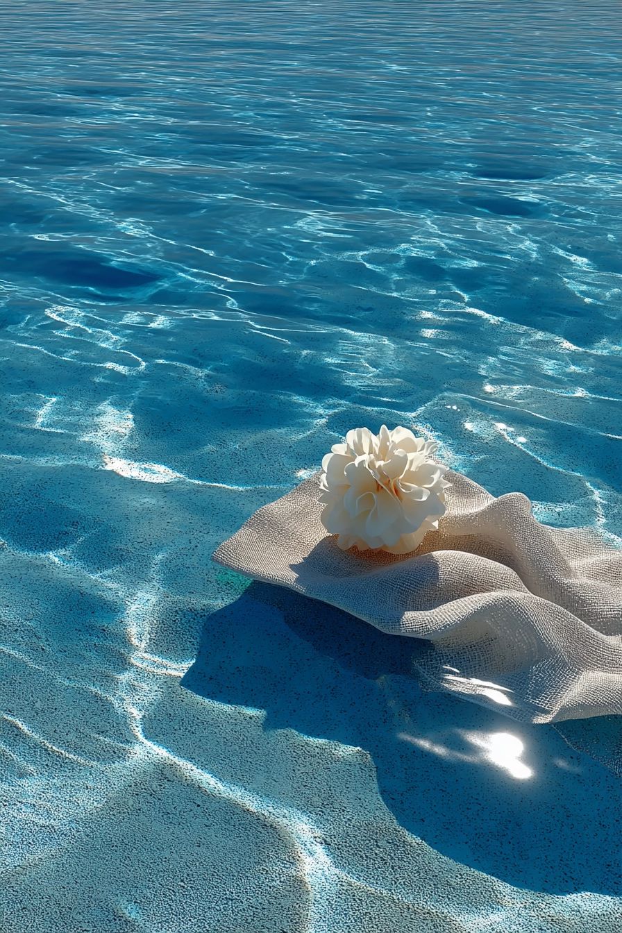 top view, blue ocean, [PROMPT] placed at the center on a white thin sheet cloth laid on the clear water, floating, volumetric lighting , shadows, depth of field. --v 7.0 --ar 2:3 --s 750 --raw