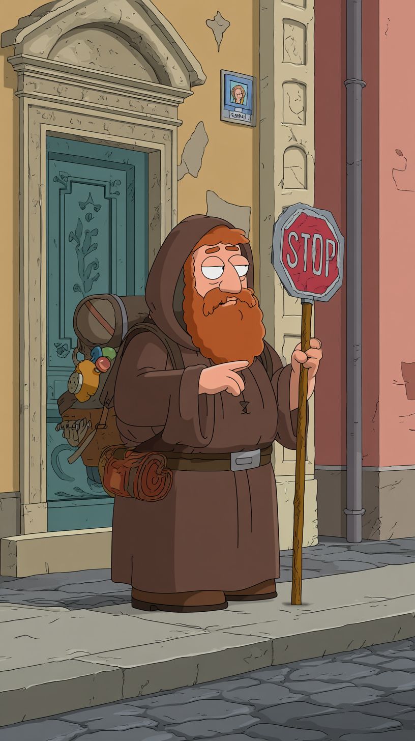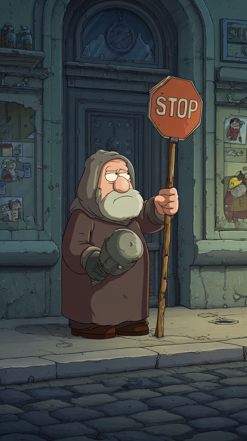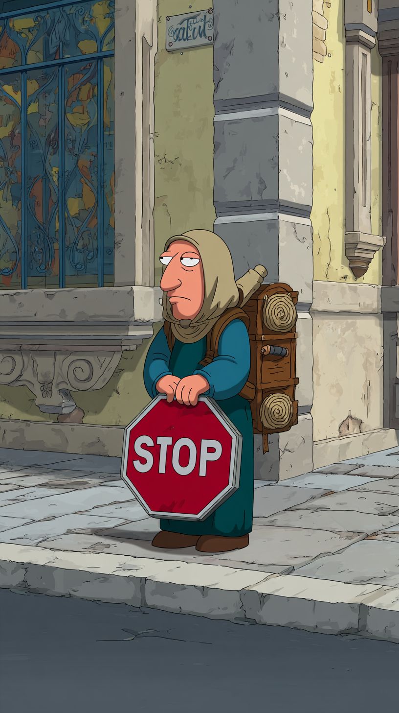 A medieval beggar holding a stop sign on the street in Family Guy style.