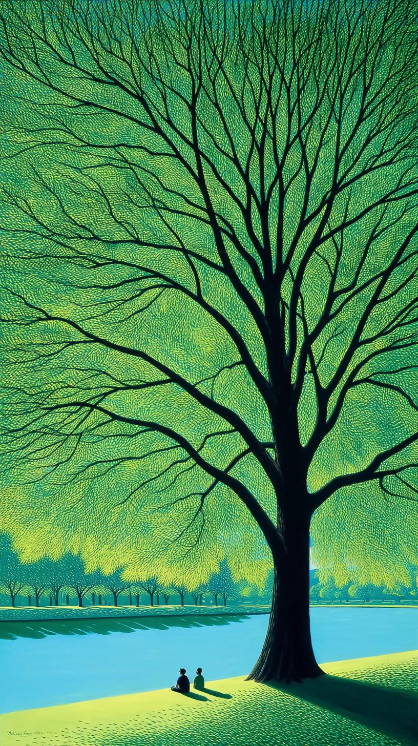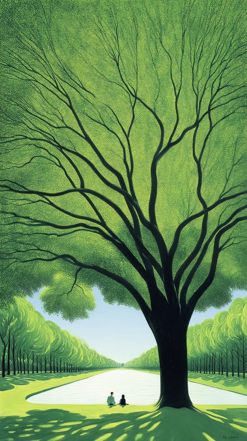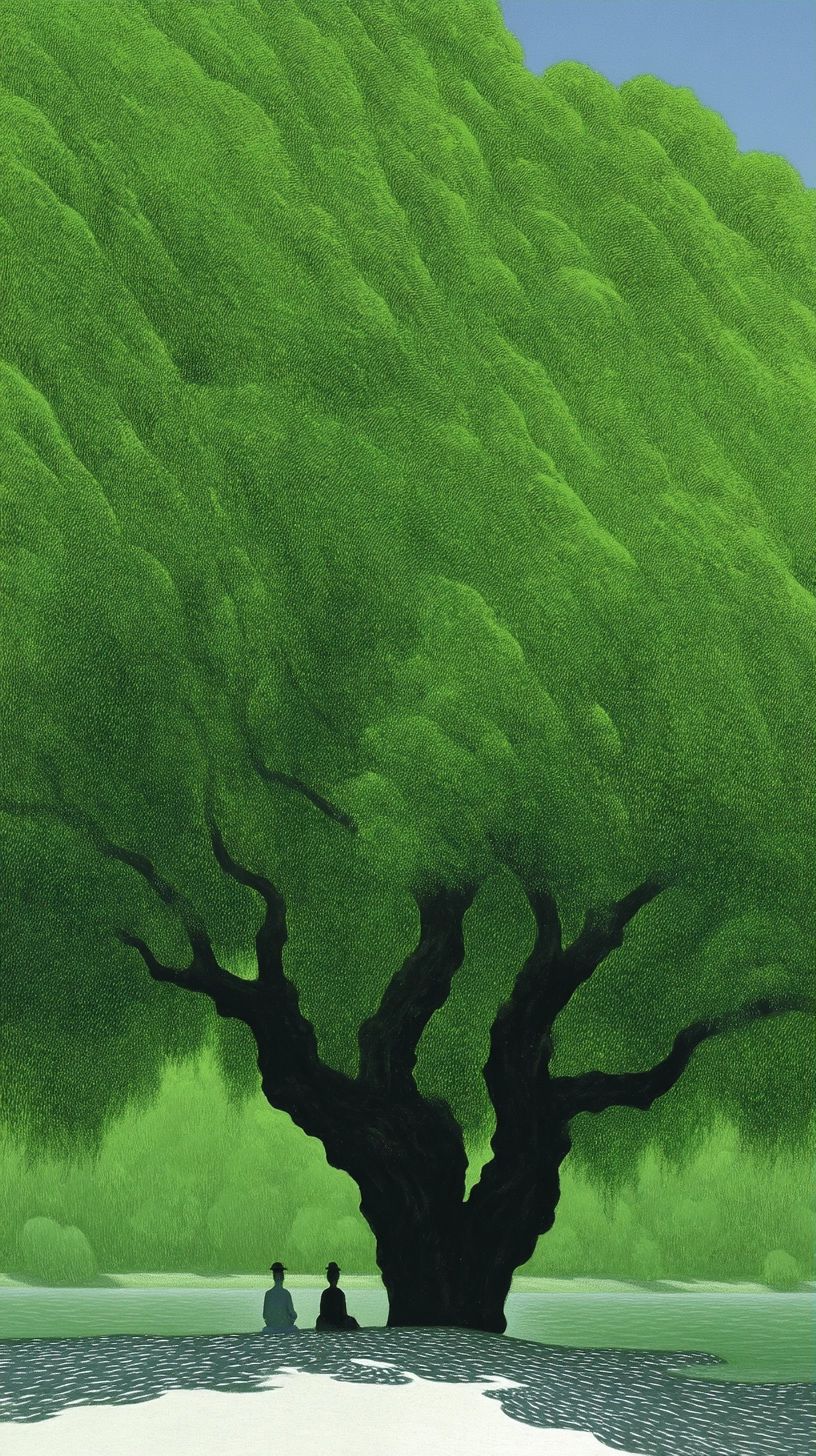 A painting of two people sitting under a huge green tree, enjoying harmony with nature.