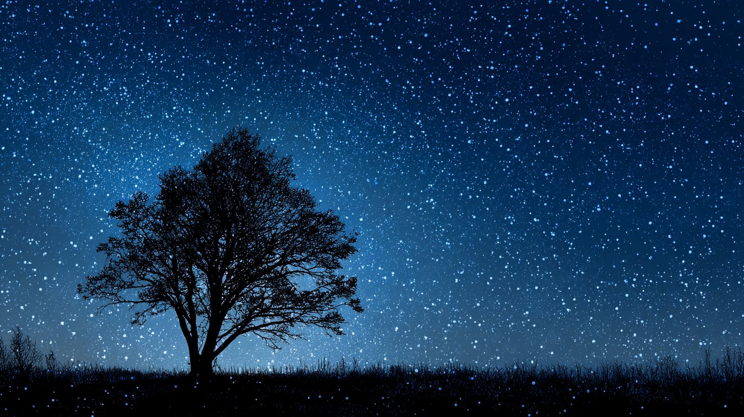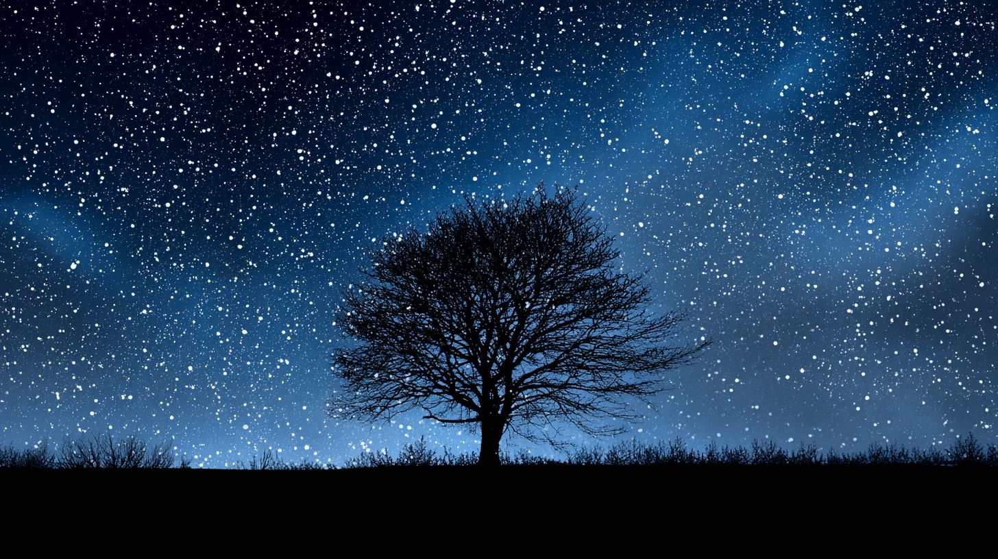 A silhouette of an isolated tree against a starry sky and falling snowflakes creates a tranquil atmosphere.