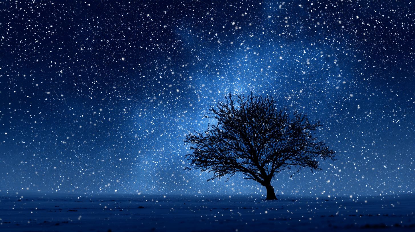 A silhouette of an isolated tree against the backdrop of a starry night sky, with falling snowflakes creating a serene and peaceful atmosphere. The blue color scheme adds depth to the scene, enhancing its tranquility.