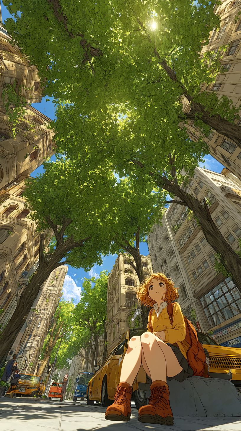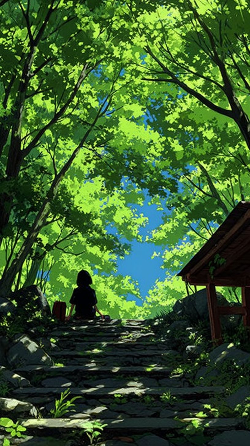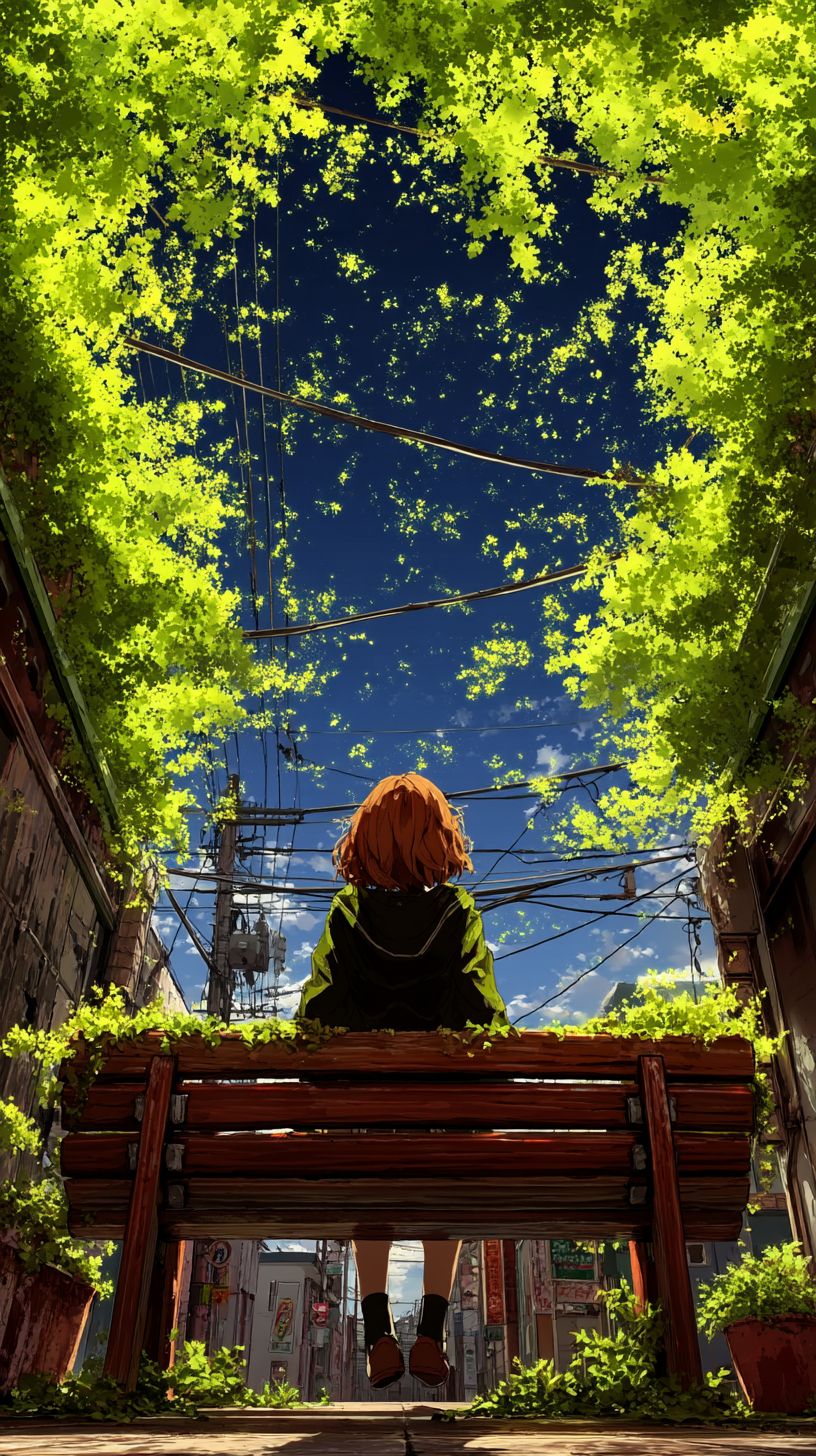 A scene from a Japanese anime, a cute Japanese girl sitting on a bench, sunlight filtering through the trees. Blue sky, lush greenery, high precision, high resolution --chaos 100 --ar 9:16 --stylize 1000 --v 7.0