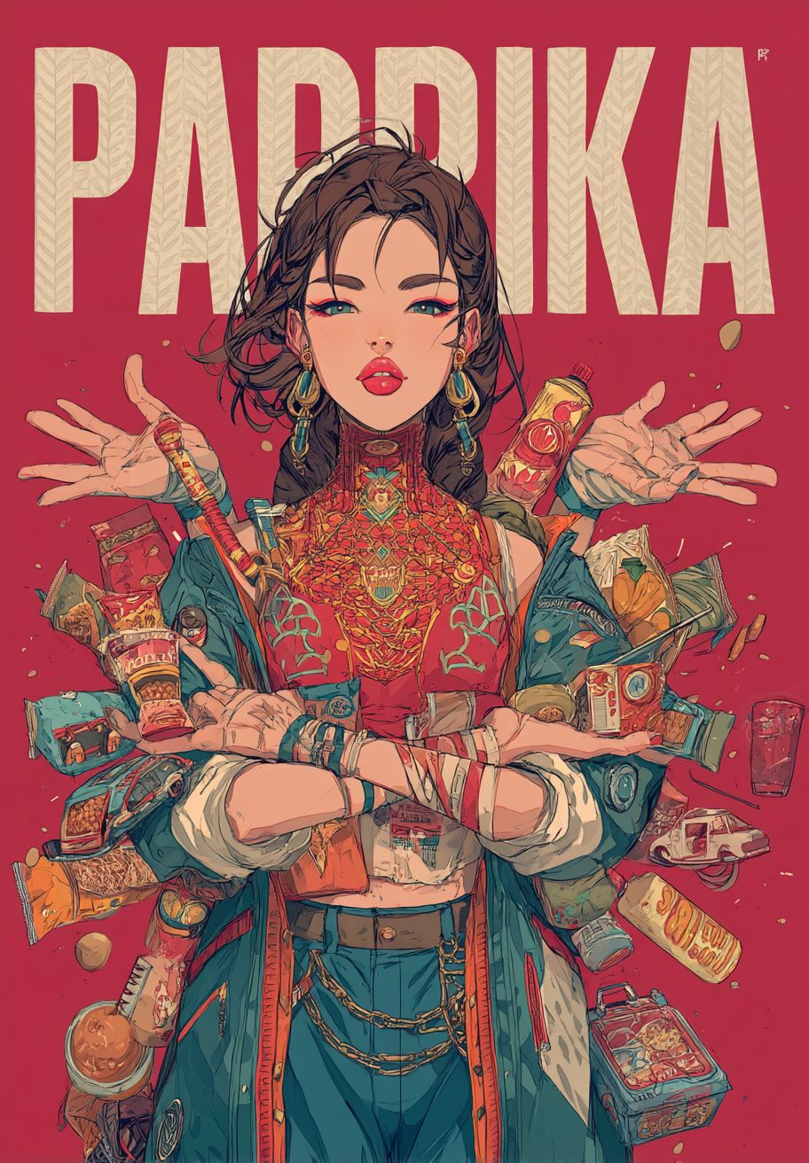 The text "PAPRIKA" is written on the red background, in an anime style. The character depicted is an attractive woman with large lips and a prominent nose, wearing stylish . She has multiple arms emerging from her torso, each holding different objects such as toy cars, toys, jewelry, or food. --ar 89:128 --v 7.0
