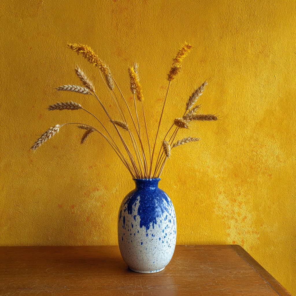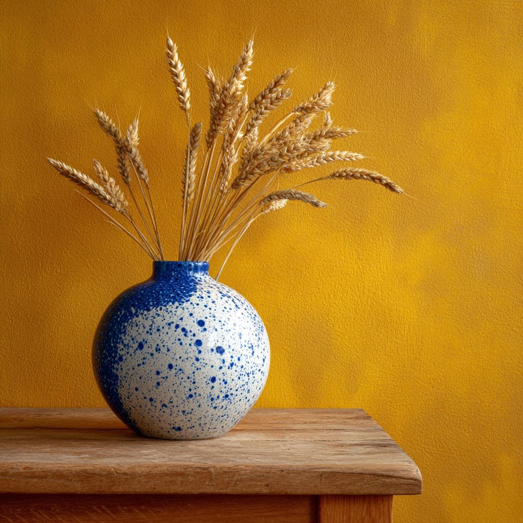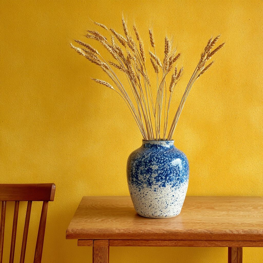 a wooden table against a goldenrod yellow wall. A blue and white speckled vase sits on the table. In the vase are several stalks of wheat. --v 7.0
