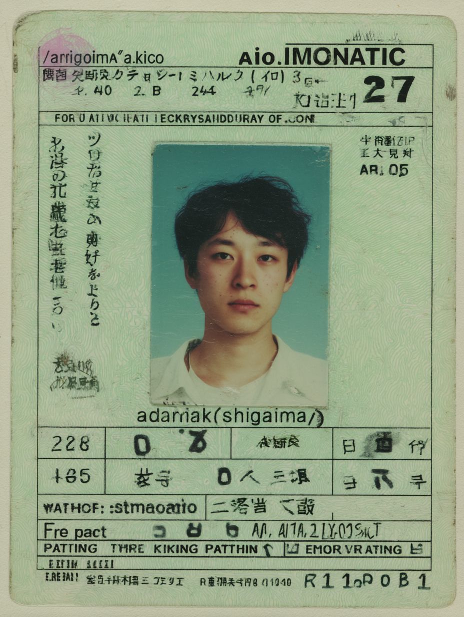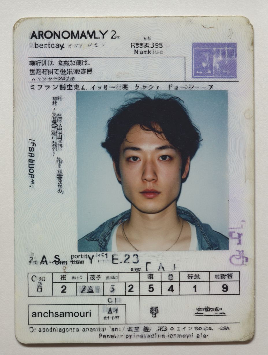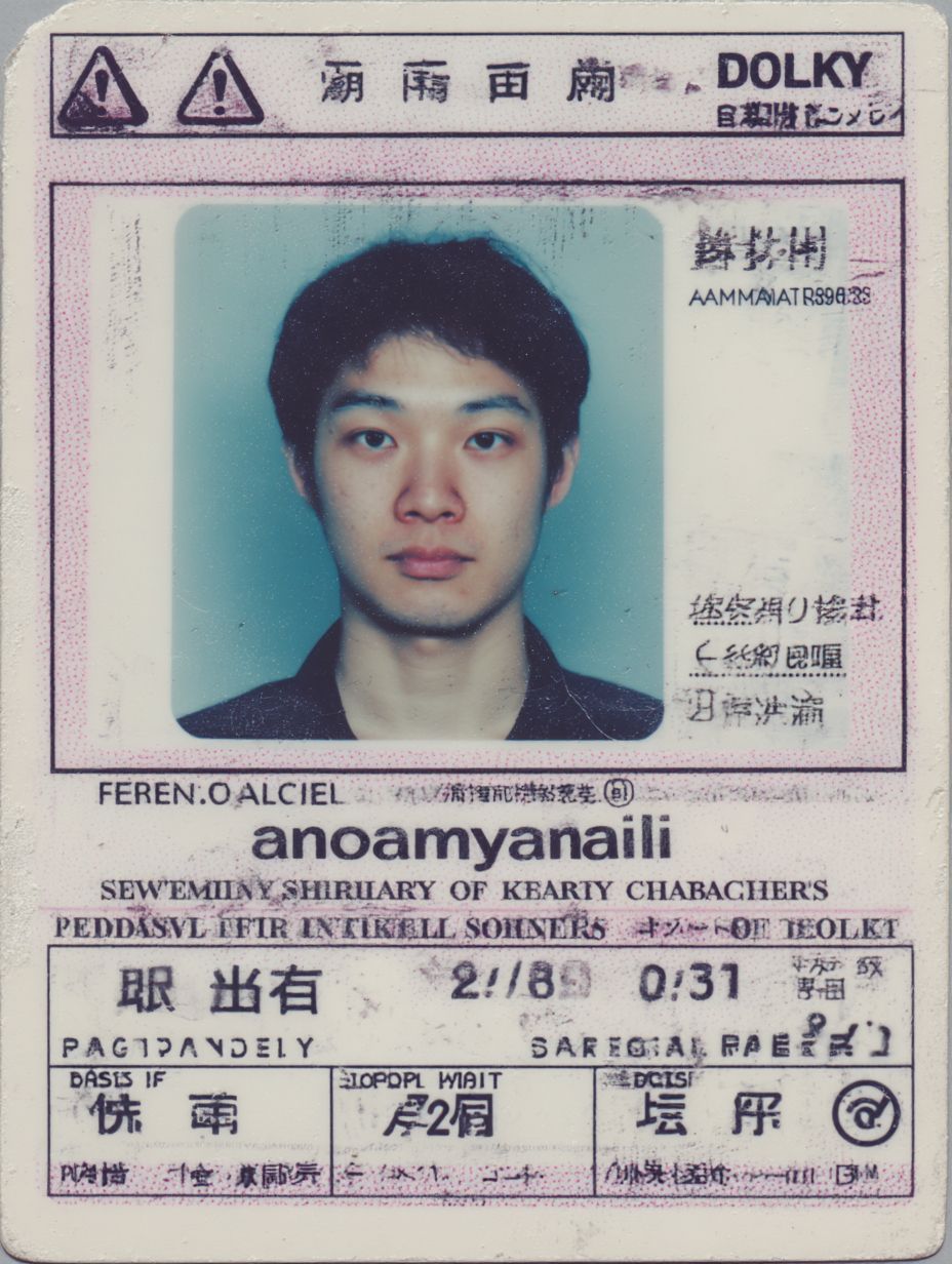 A photo of an ID card with the name " anomaly" and picture, on it is written that he". The date reads February sixchaudry., the gender text was not displayed in Japanese style", age 25 years old , at . Man's head portrait shows his face from above. In front there’s white paper with black numbers on them representing road safety skills like parking and mirror eyeightening for seat components. At top left corner you can see 'ahiragicao' sign written in English." There should be small icon to show some kind of traffic door training course to represent health security at work by company named K Dock --ar 3:4 --profile 53tda19 --v 7.0