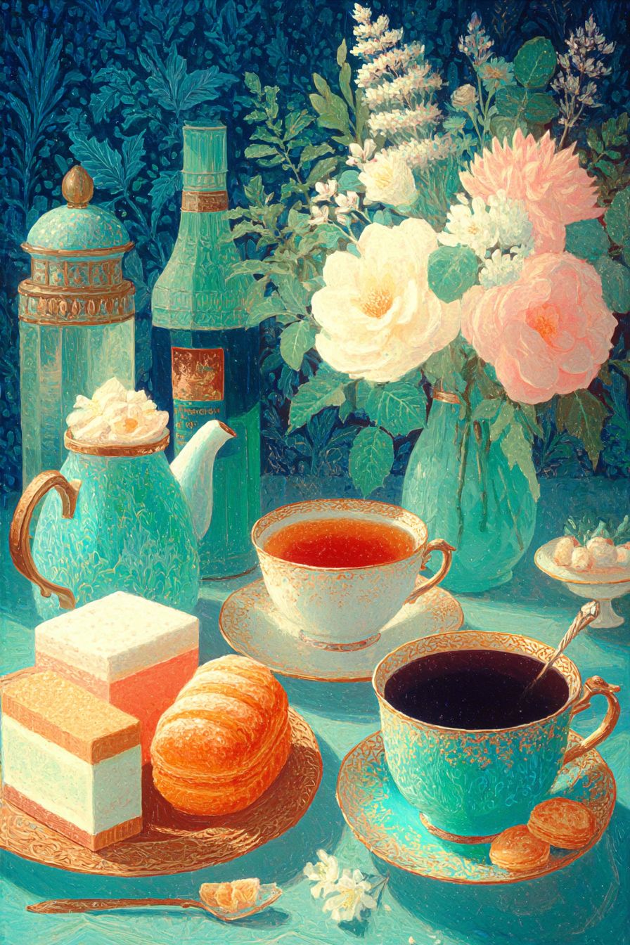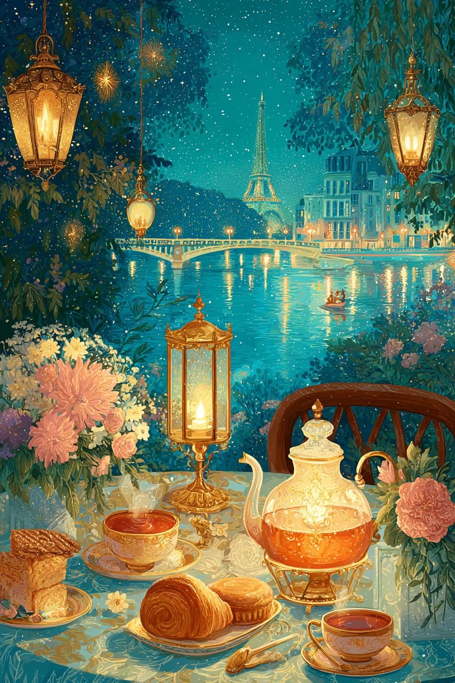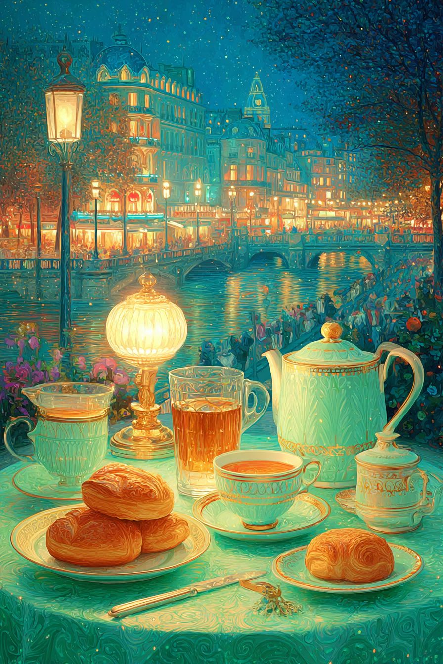 tea and kouign on a table in Belle epoque Paris, in the style of illuminated visions, whimsical collages, tempera, magewave, wizardcore, atmospheric paintings, scene painting --ar 2:3 --profile 4rjvqlo --stylize 250 --v 7.0