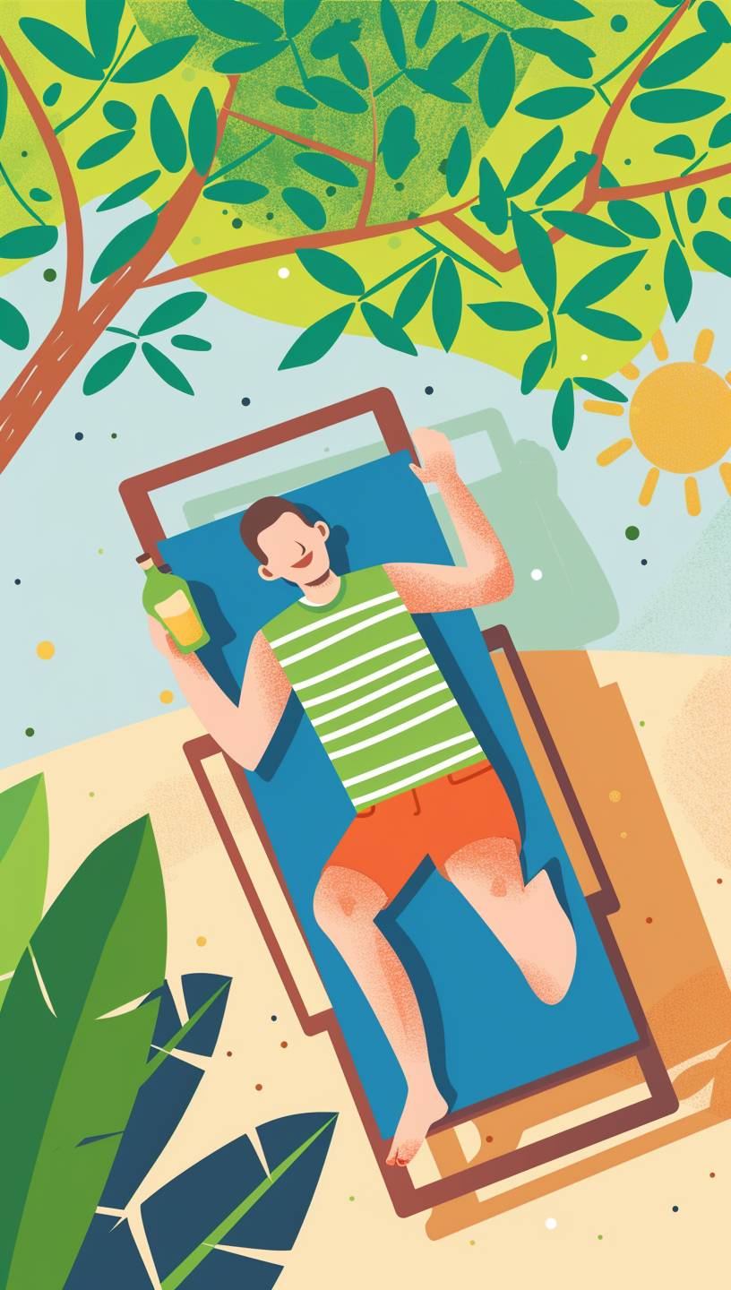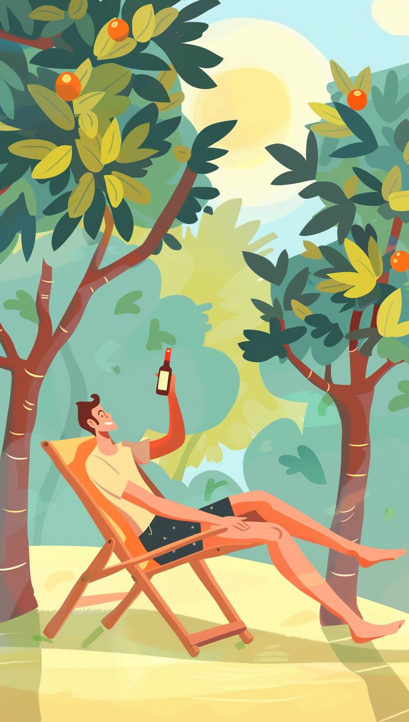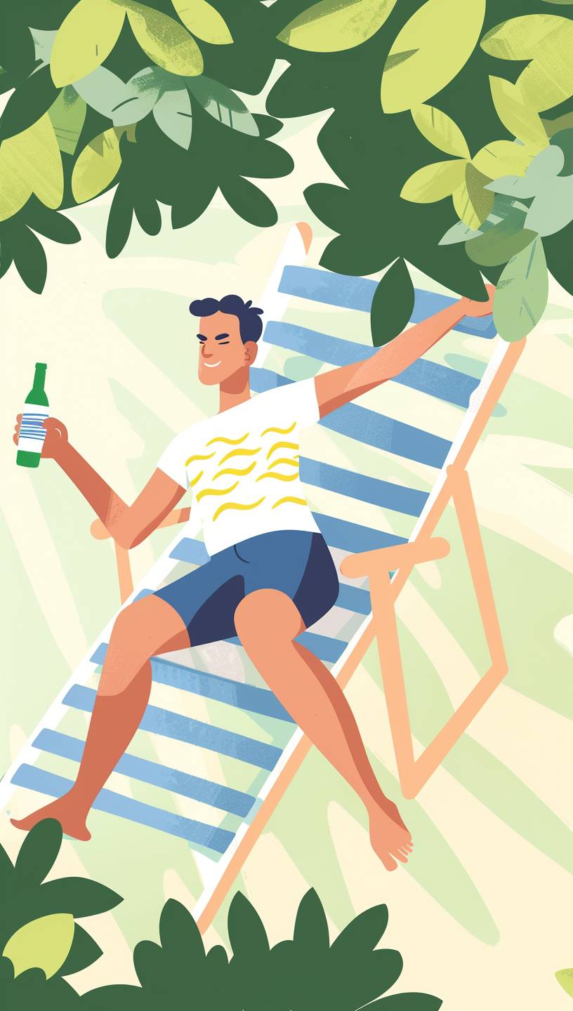 The handsome, thin man was lying on the deck chair under the tree, holding a bottle of drink in his hand and lying leisurely on the deck chair. From a bird's eye view, the background is lined with green trees and the sun is shining brightly, giving a summer feel, with simple lines, bright colors, and flat style cartoon characters. --ar 55:97 --stylize 50 --v 6.0