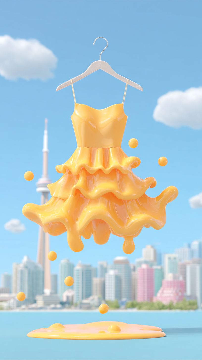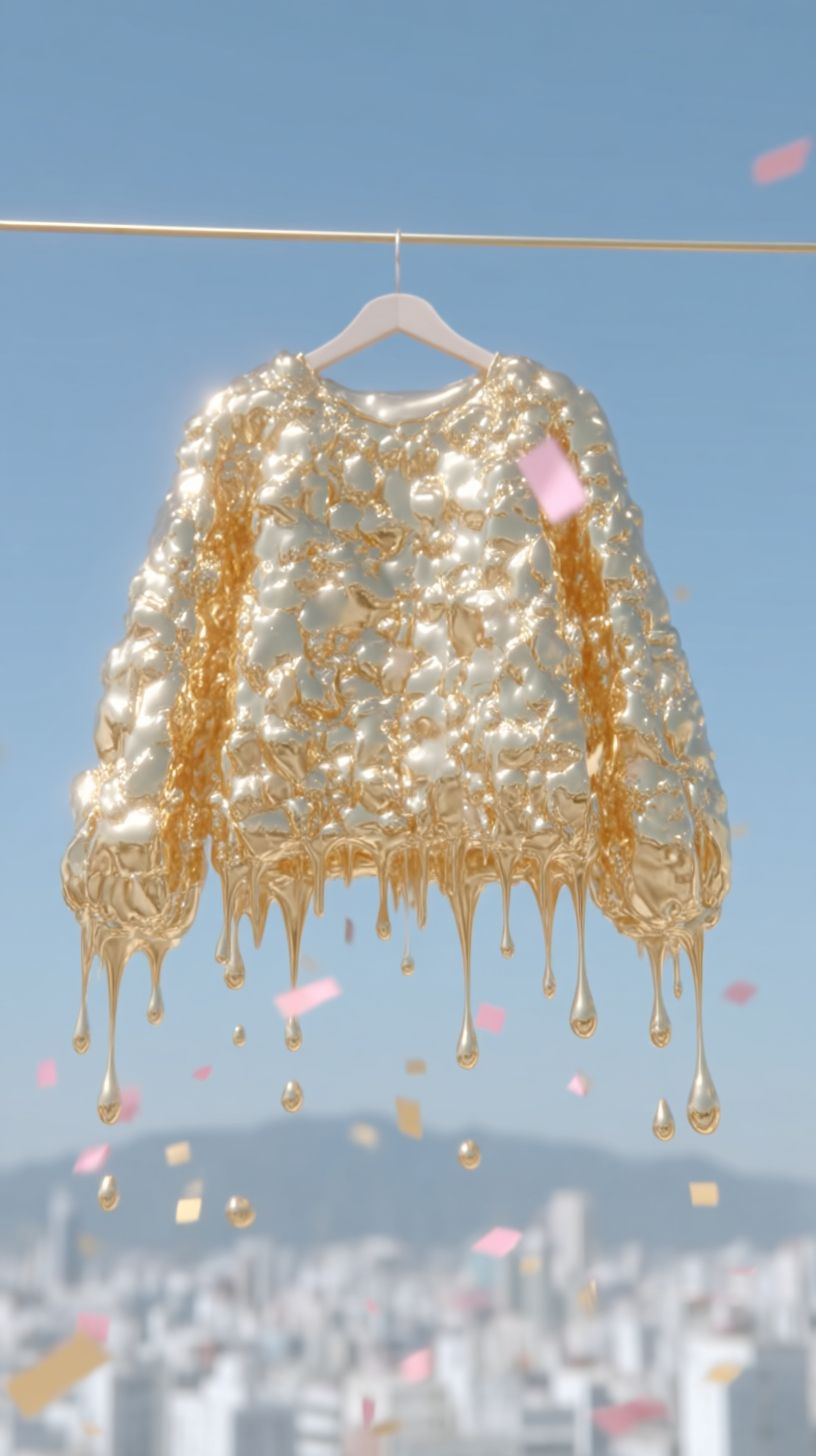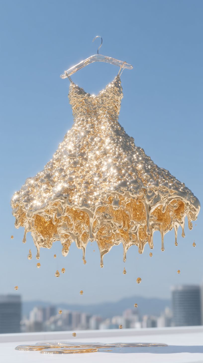 A hyper-realistic golden dress floating in mid-air, hanging on a black hanger. The dress's edges are melting or dripping like liquid gold, with drops falling gently onto a smooth surface below. The background is bright and minimalistic, soft lighting. Ultra high detail, cinematic style, 8K, photorealistic, studio lighting, surreal touch, The super cute girl is being funny and making faces to make people laugh, 3D palm icon reaching forward, interactive UI, three hands of different shapes touching a slender orange beer can under a clear blue sky. There is no text on the orange can. The energy of a party, bright sunshine, sharp color contrast, and outdoor joy, summer advertising style. The scene is described as highly realistic, emphasizing photorealistic textures, lighting, and details. The weather is clear and the sky is blue, enhancing visibility and contrast. Paired with visible fireworks or fireworks, it creates a dramatic visual focus. The city skyline in the background places the event in an urban environment, enhancing the feeling that victory is about to come. And evoke strong cultural associations. A highly realistic depiction of a clear day, a bright blue sky, and a city skyline in the background. The visual style requires a high degree of realism, imitating real-life photography. This approach aims to enhance the emotional impact of the audience by making the extraordinary event (celebration of victory) real and direct for the audience to immerse. --chaos 33 --ar 9:16 --exp 10 --raw --sref 3087926378 --profile s5fbf8i --sv 4 --stylize 650 --v 7.0