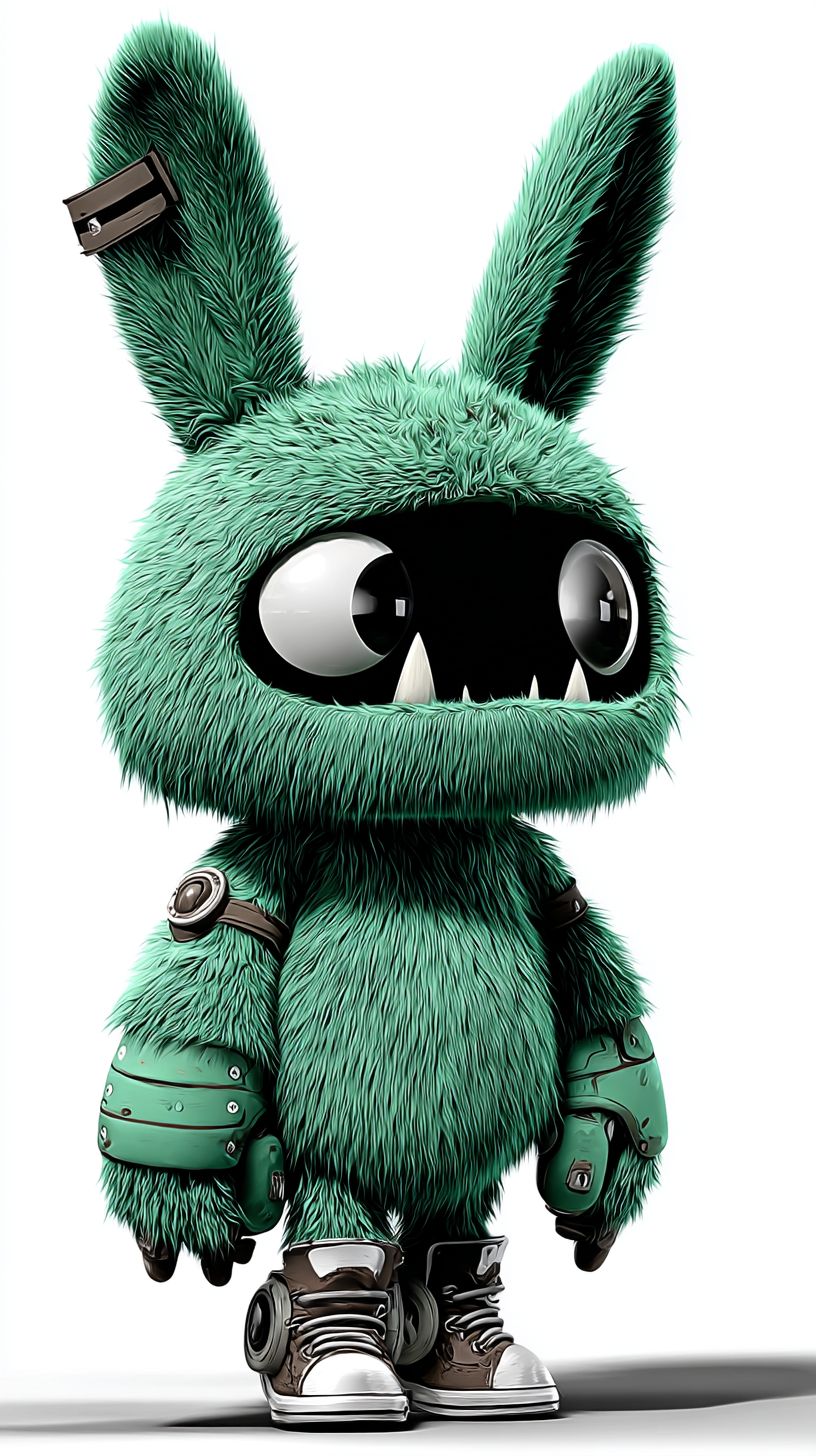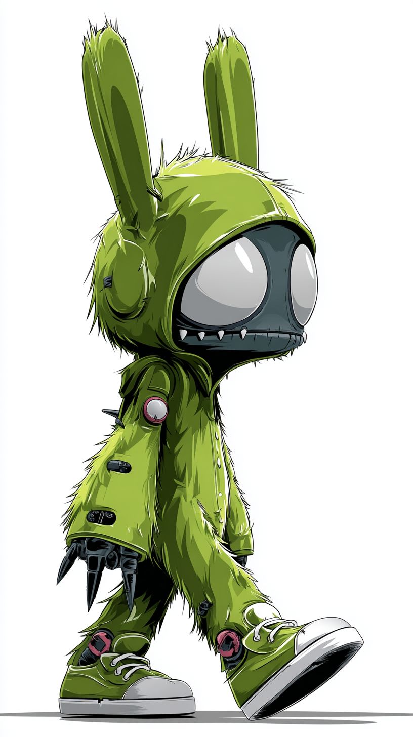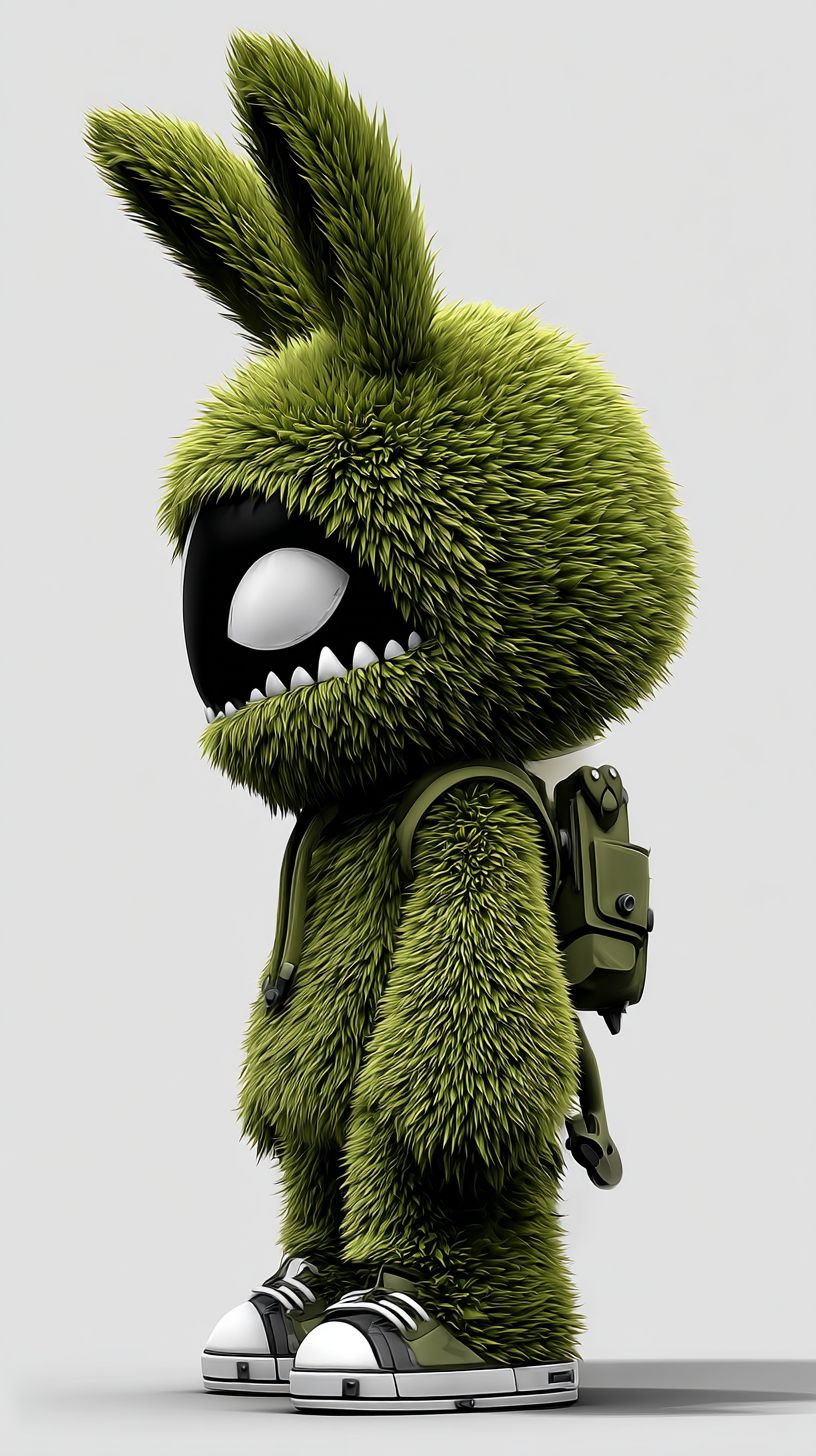 A cute, green fuzzy creature with oversized ears, big Pixar-style eyes, and small sharp teeth is walking in side profile, facing away, in a simple, flat illustration style, with no background. The design is charming and slightly mischievous, with a cartoonish aesthetic, a bold color palette, and a unique character design featuring soft textures, stubby limbs, and playful proportions, using simple shapes, cel-shaded details, and minimalist elements, with no shadows. --ar 9:16 --profile 7obvh1j --v 7.0 --s 250 --raw