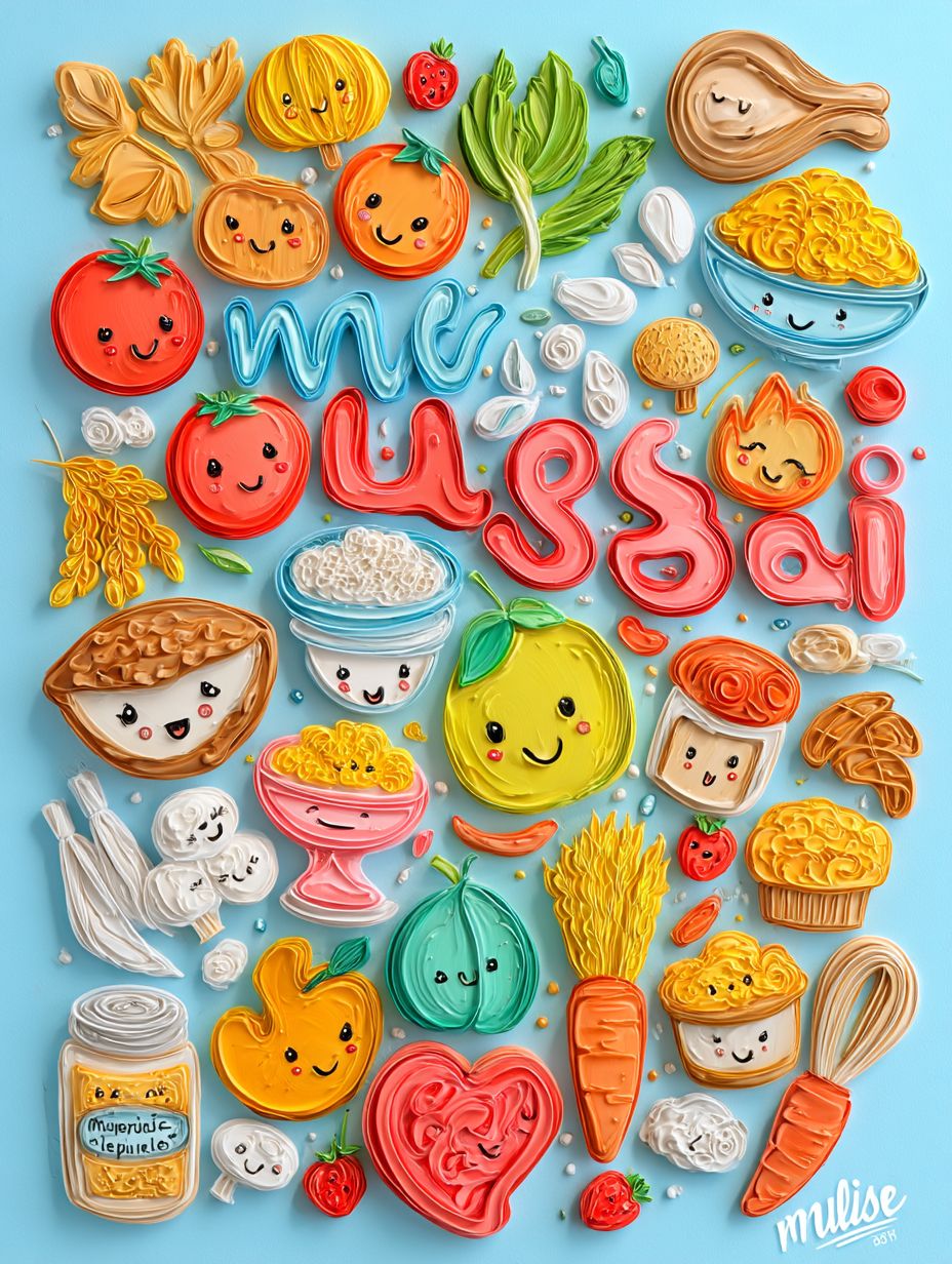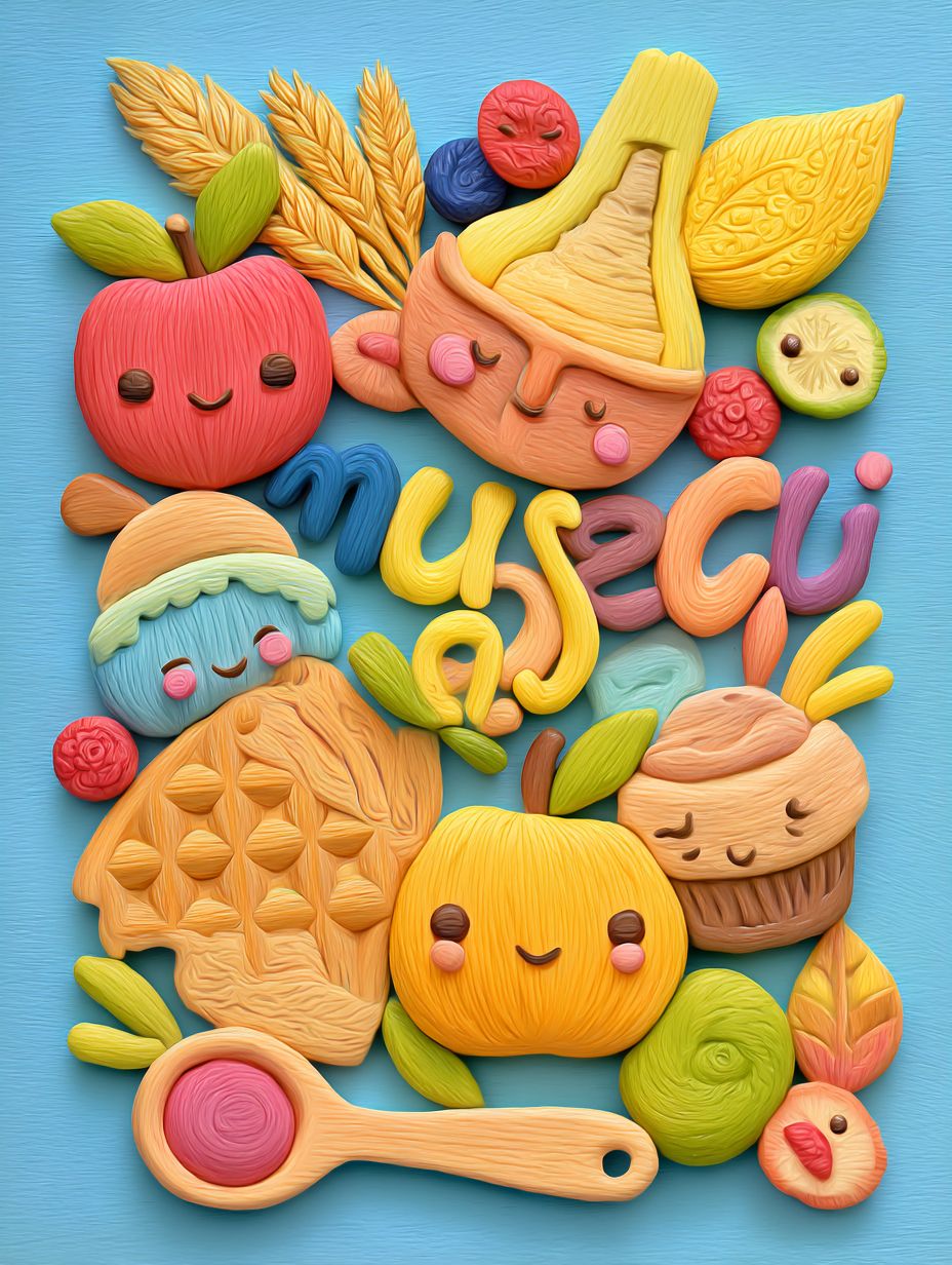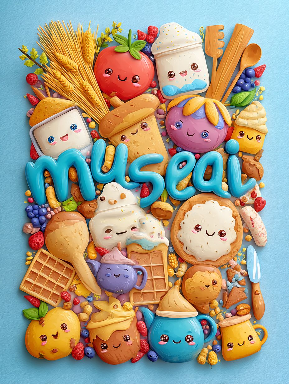 Illustrate the words "musesai" with images of cute cartoon food and baking supplies that have smiling faces like tomatoes, grains, onions, apples, berries, waffles, and muffins. --ar 3:4 --profile 1bsmyqs ttz4zdp --v 7.0 --s 250 --raw