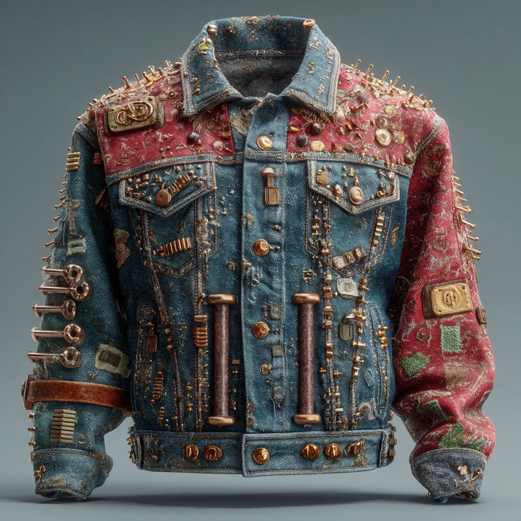 creative designs of a jean jacket designed with construction nails inspired by heavy metal aesthetics photorealistic 8k clarity b --v 7.0 --s 250 --raw