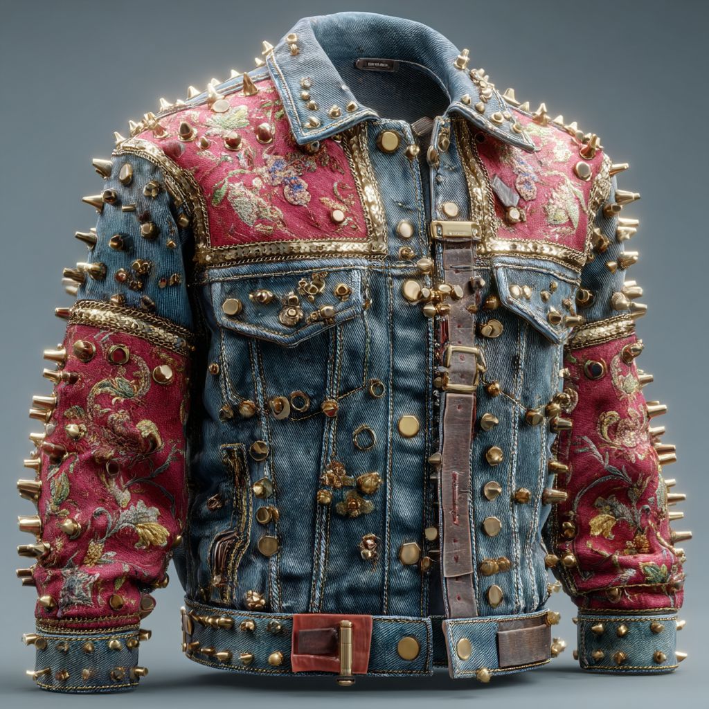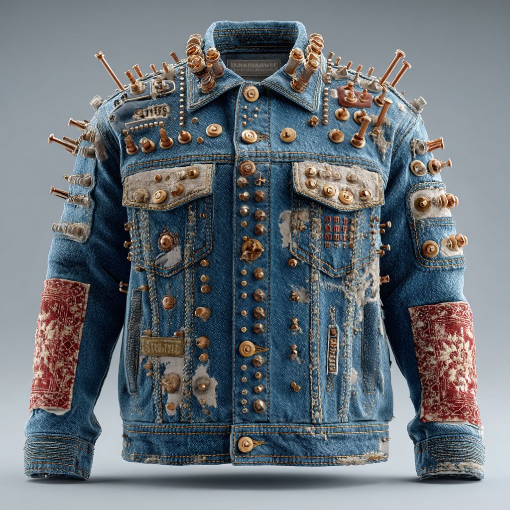A creative design of a jean jacket inspired by heavy metal aesthetics with construction nails