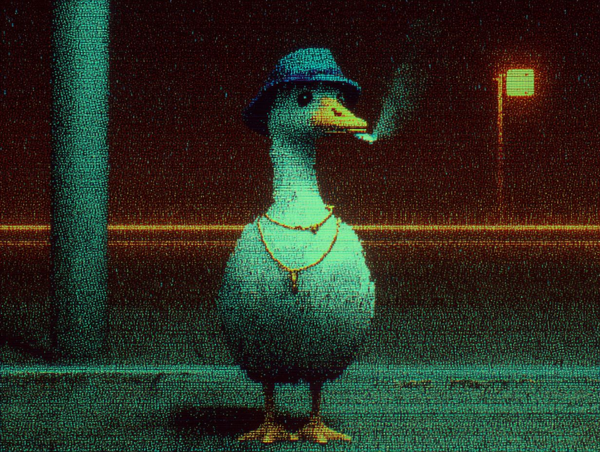 Overhead angle, pixelated Goose smoking, wearing a bucket hat, under a streetlight wearing gold chain, melancholic expression, 90s low-poly video game style, muted colors, concrete sidewalk, slightly glitchy lighting, dark night setting, CRT screen filter --chaos 5 --ar 4:3 --raw --profile jsavs1l --stylize 250 --v 7.0