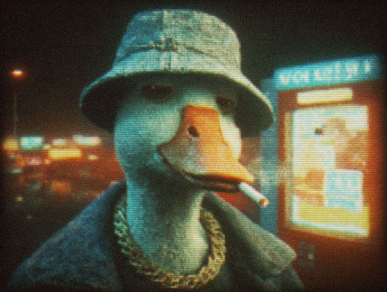 Pixelated goose smoking under a streetlight wearing a bucket hat and gold chain with a melancholic expression in 90s low-poly video game style