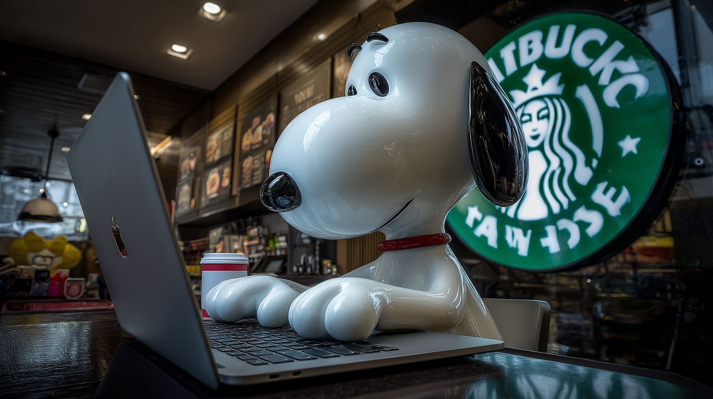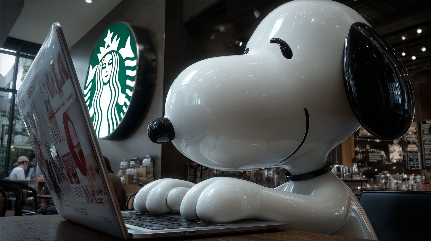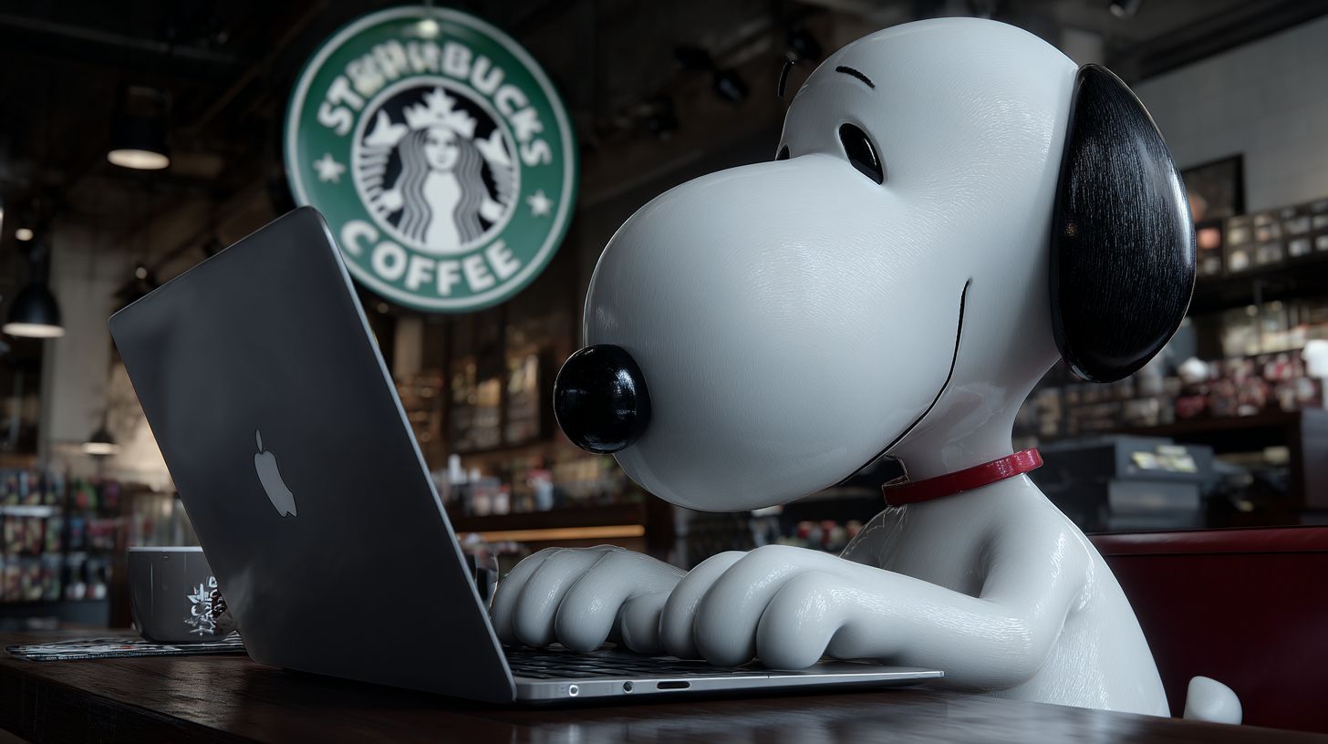 Cartoon Snoopy is working on a MacBook at a Starbucks table