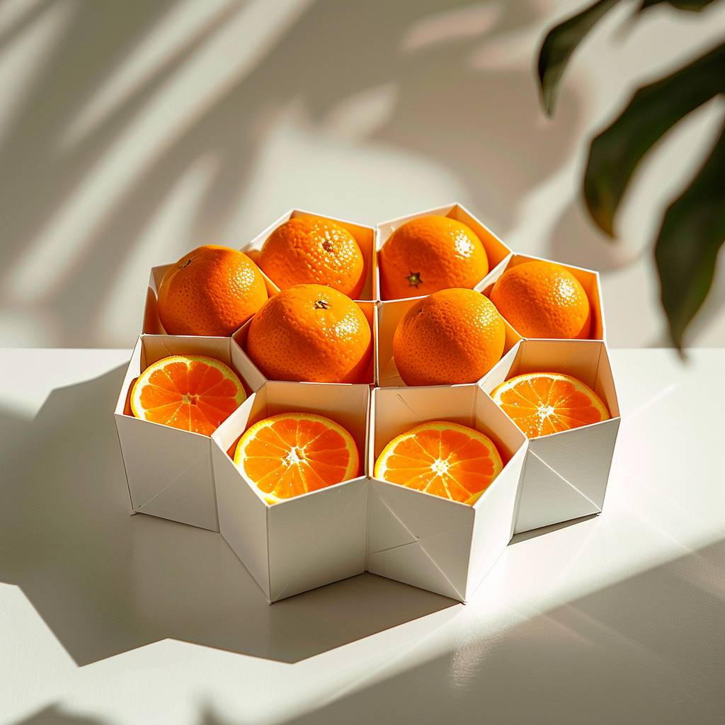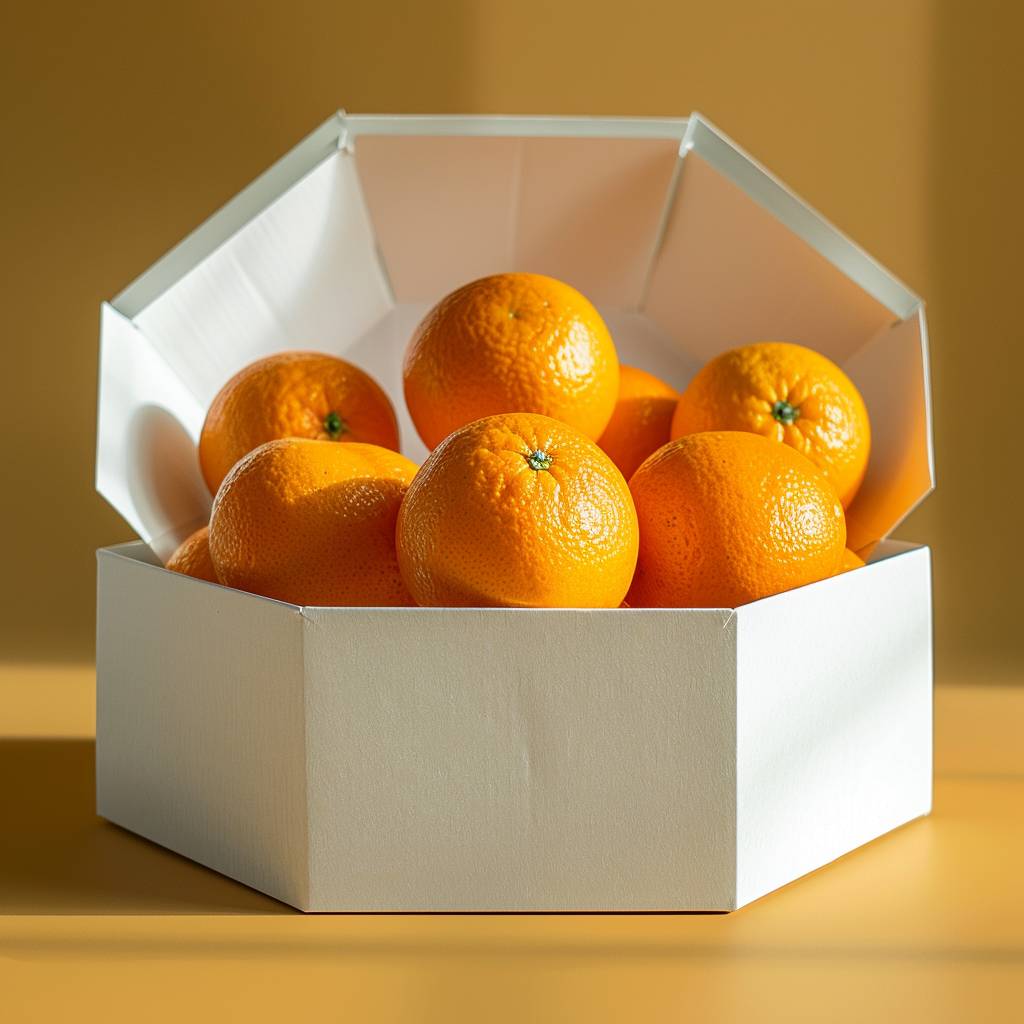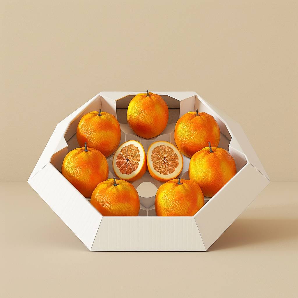 Octagonal white cardboard box for oranges, featuring octagonal slots and corrugated cardboard walls.