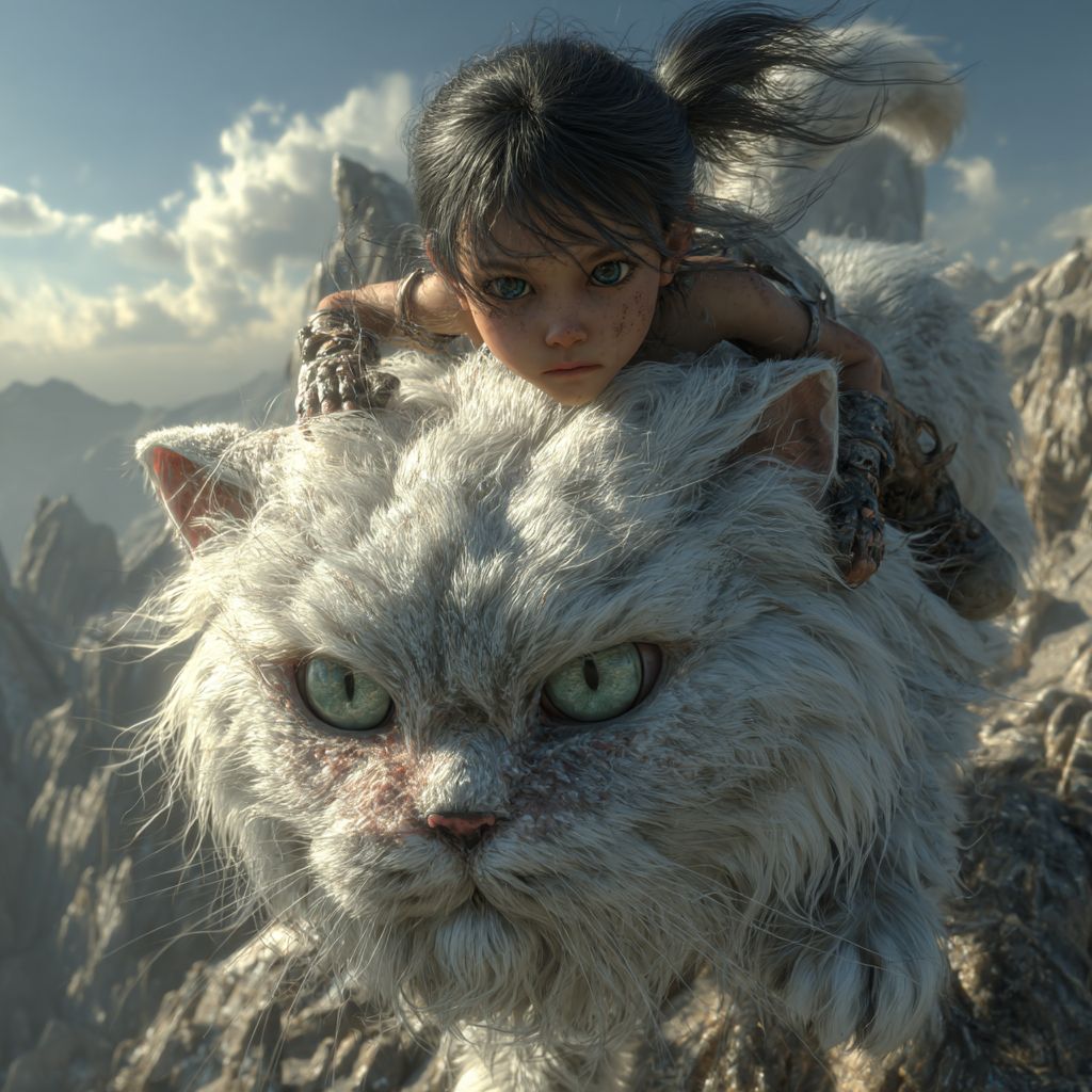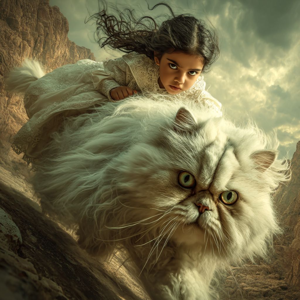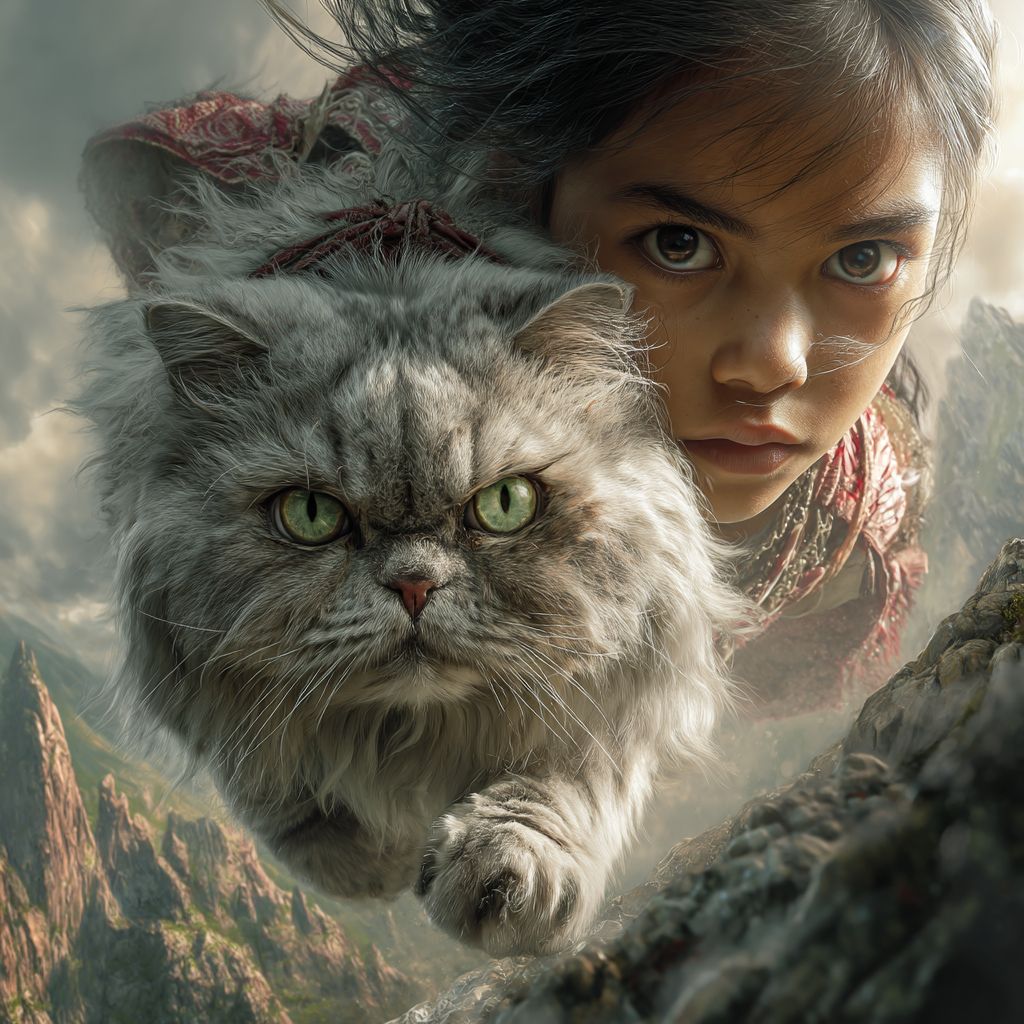 Ultra-realistic photo of an adorable but determined little Persian girl running over a rocky mountain pass with her huge Persian cat at sunrise. The mood is clear. The Persian girl has a detailed facial expression and crystal green eyes that convey courage and concentration. The lifelike skin texture is illuminated by natural sunlight on the faces. Rivers, mountains and cliffs can be seen in the background, bathed in the soft shadows of the sunrise. Realistic colour grading, cinematic composition and DSLR quality with detailed facial rendering. --v 7.0 --p qbktiqd --raw